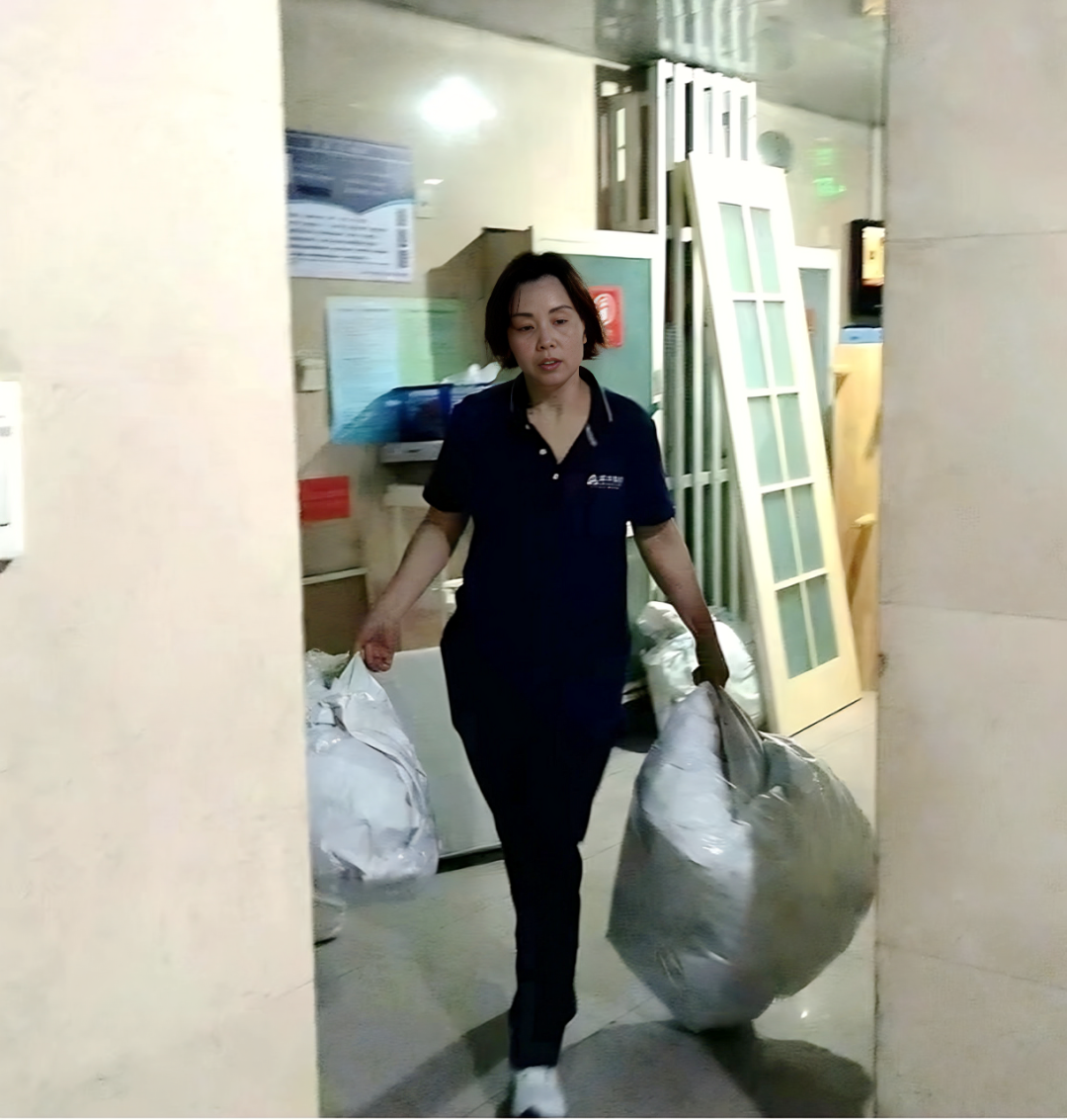 现场一片狼藉,一层与地下室浸水,珍贵藏书画作岌岌可危。吴晓凤果断协调吸水设备,带领团队展开抢救。面对设备局限,她与同事们徒手接力,一桶桶将地下室积水转运至一层,雨水与汗水浸透衣衫。