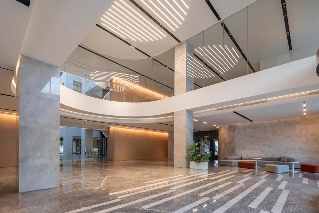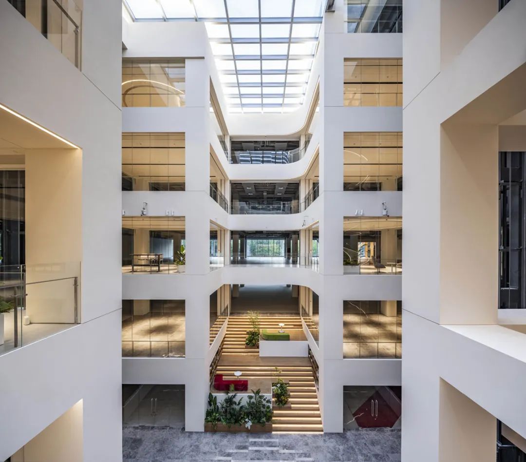 同时由于既有建筑缺少大堂、休闲空间等办公建筑必备的核心区域,故在主要展示面(北侧)及车站临近面(西侧)设置主次入口大堂,兼顾企业形象展示及员工流线的便利性。而特色十字中庭的景观电梯和旋转楼梯构成了建筑的中央枢纽。同时可以围绕艺术楼梯周边举办各种讲演,展览,休闲等日常活动,打造共享交流空间,为舒适的办公环境打下基础。