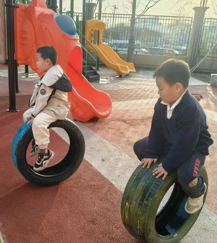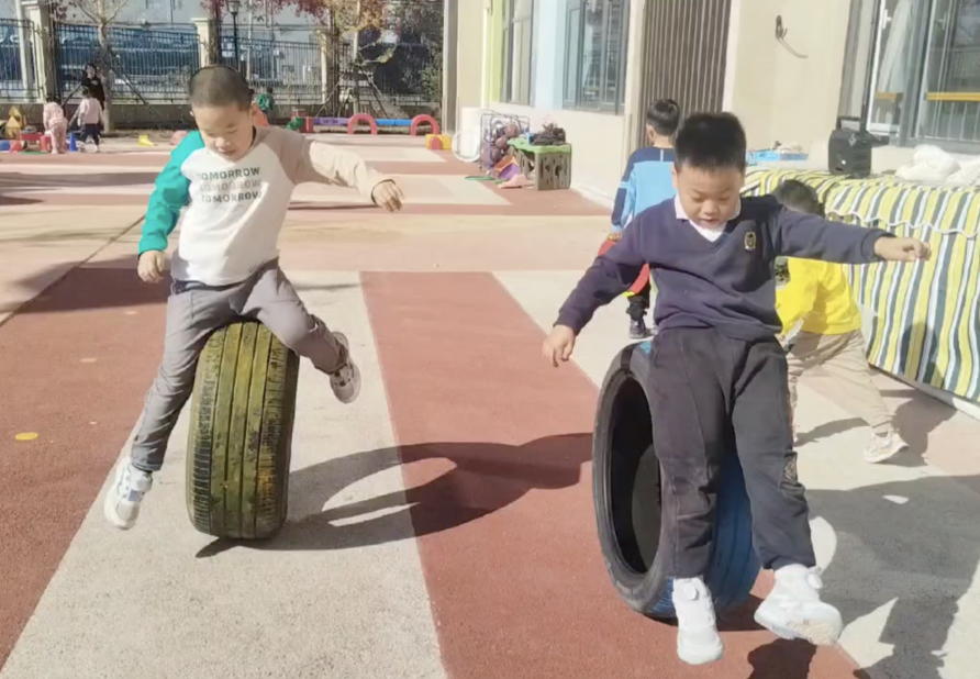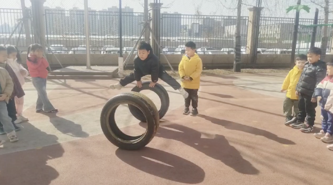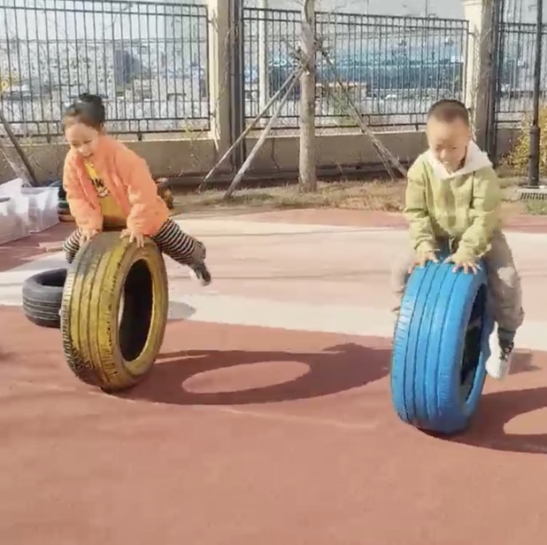 当男孩子们看到女生在玩轮胎时玩出了如此多的花样,他们立刻被激发了斗志。强烁和小贝不甘示弱的开始着手设计全新的玩法。他们一边滚动轮胎,一边尝试跳上轮胎。虽然过程中偶有失败,但他们毫不气馁,不断进行着探索和尝试。终于,他们成功地在轮胎滚动的瞬间跳了过去。他们还为这个游戏起了一个非常有趣的名字——平衡车。