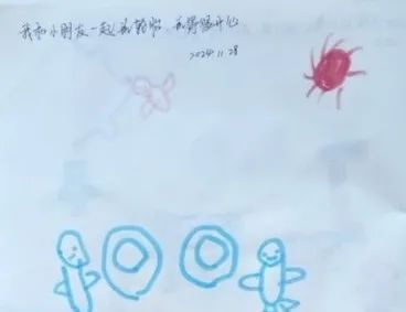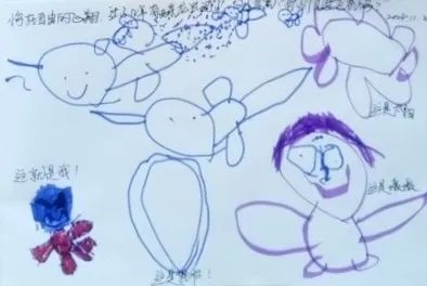 孩子们将自己在户外游戏时的欢乐场景描绘了下来。强烁的画尤为引人瞩目,他不仅画出了与小贝一起玩轮胎的场景,还在画面中加入了丰富的想象元素:天空中,小鸟自由地飞翔,飞机呼啸而过,甚至还有龙在云端穿梭……这些奇妙的元素共同构成了一个充满奇幻色彩的画面。孩子们的想象力真是天马行空,丰富无比。