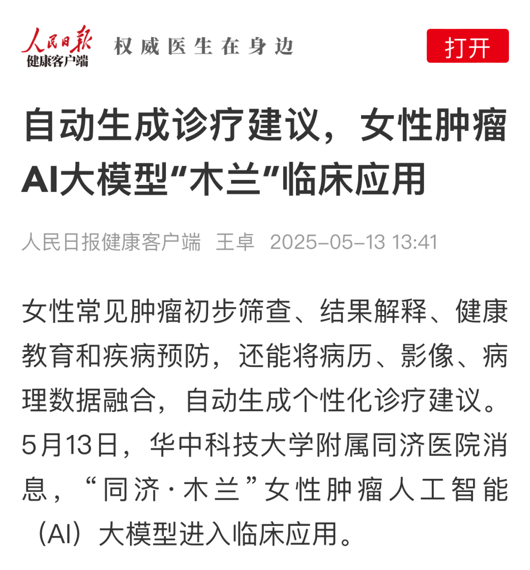 女性常见肿瘤初步筛查、结果解释、健康教育和疾病预防,还能将病历、影像、病理数据融合,自动生成个性化诊疗建议。5月13日,华中科技大学附属同济医院消息,“同济·木兰”女性肿瘤人工智能(AI)大模型进入临床应用。