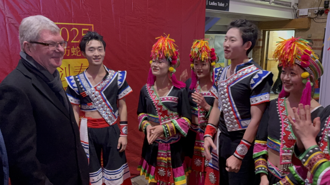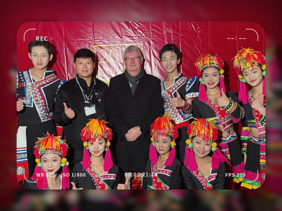在2025英国剑桥春晚的舞台上,大卫·卡德韦尔教授见证了昆传学子的卓越才华与独特风采。晚会结束后教授同昆明传媒学院星辰艺术团师生互动合影,并对他们的精彩表演给予了高度评价。
