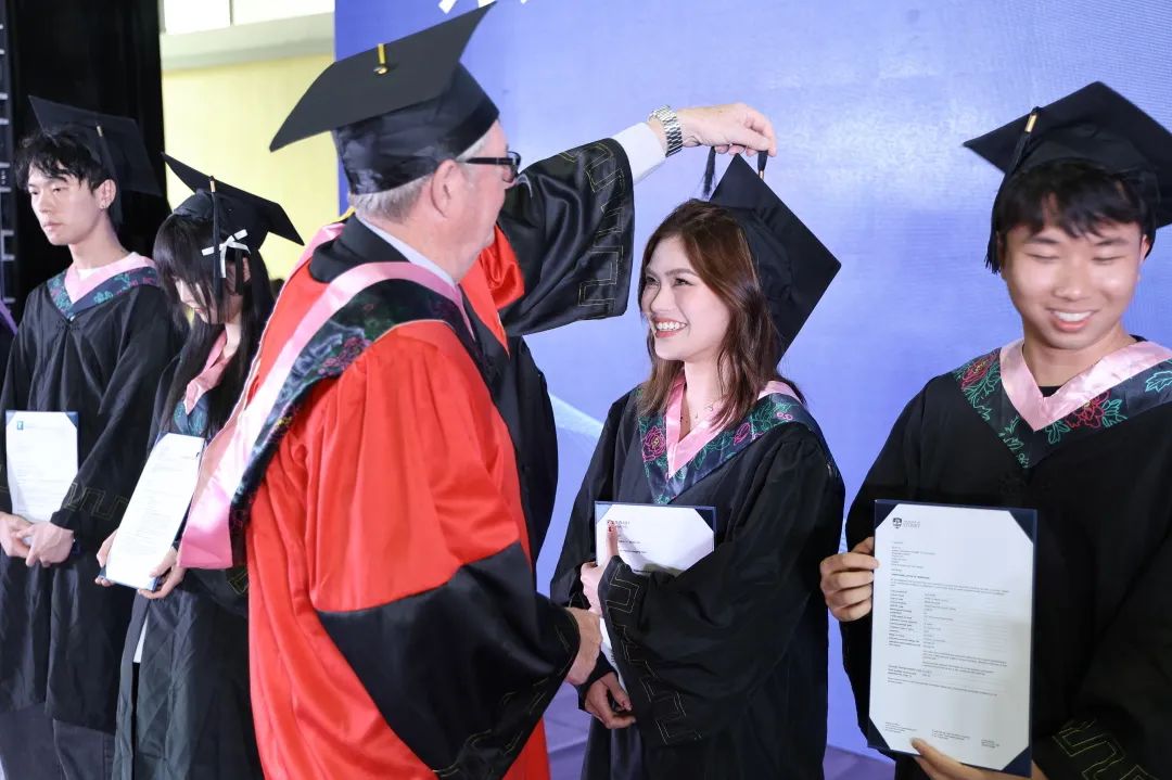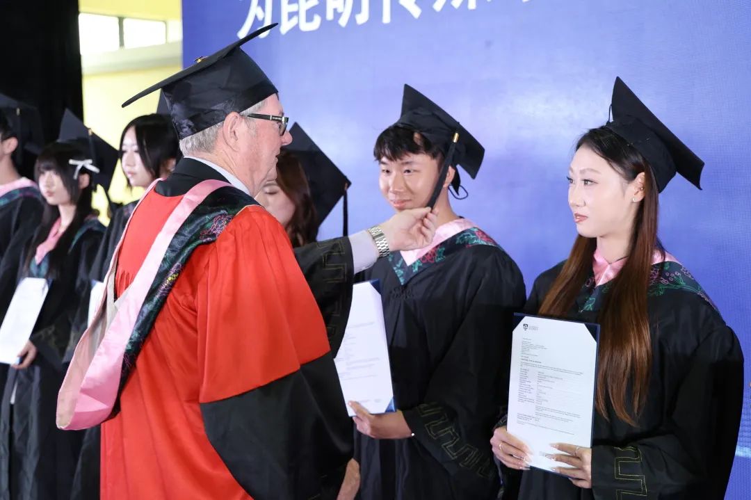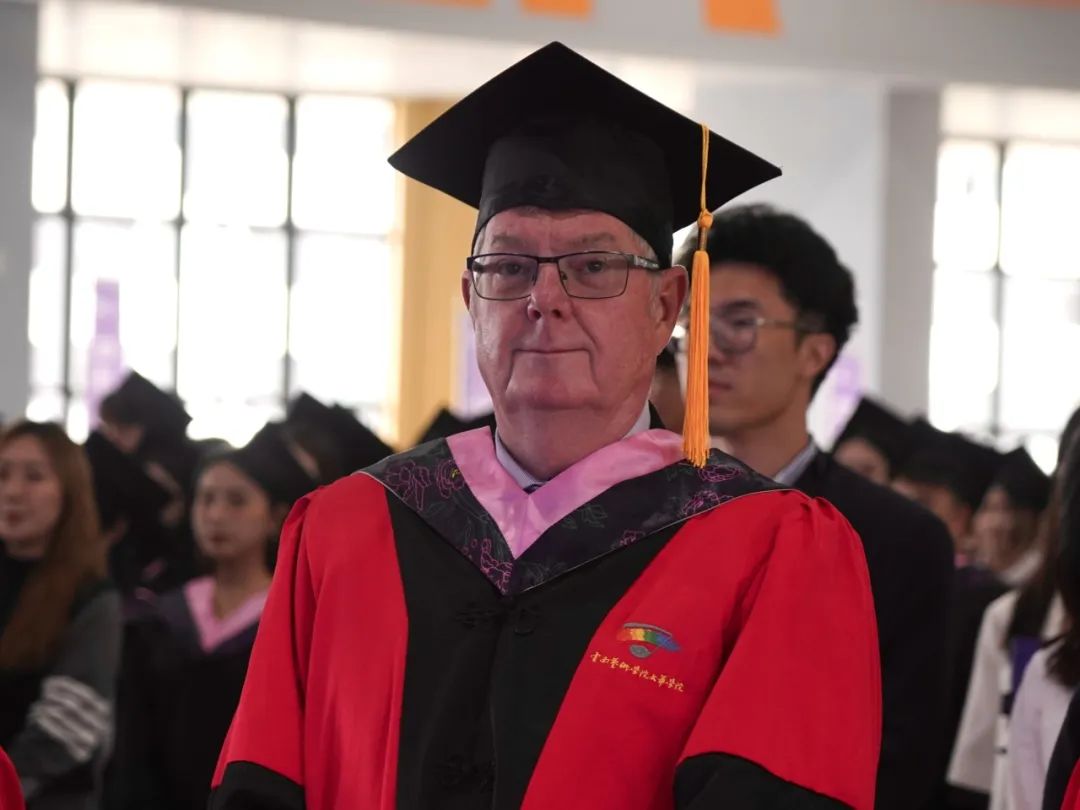 剑桥大学前副校长大卫·卡德韦尔教授为昆明传媒学院2025届国际学院毕业生拨穗。