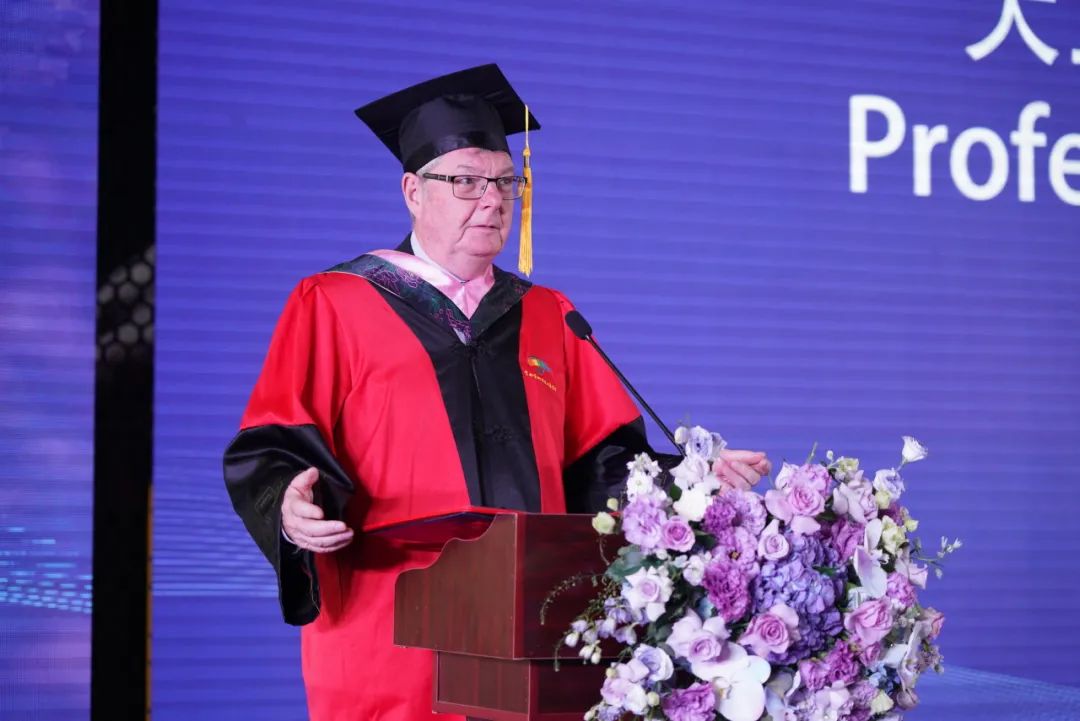 毕业仪式上,剑桥大学前副校长大卫·卡德韦尔教授为毕业生送上寄语。他表示,在2025年的英国剑桥春晚的舞台上,有幸见证了昆传学子展现出的卓越才华与独特风采。昆明传媒学院与剑桥大学虽地处东西方,却共享着对知识、创新与文化交流的追求。教育的未来,正藏在像同学们这样年轻、大胆、充满想象力的头脑里。而传媒与科技的未来,更需要同学们用创造力去打破边界,讲述全新的故事。未来,希望能与昆传学子共同探索更广阔的可能性,祝福每一位毕业生“毕业快乐”。
