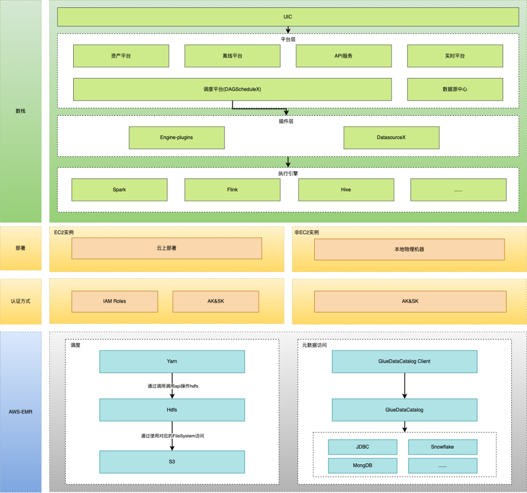 计算:对接 EMR on EC2,实现弹性调度与自动伸缩数栈核心调度组件支持 Spark / Flink 等引擎运行在 EMR on EC2 模式下。通过集成 AWS SDK 及 EMR API,完成:
