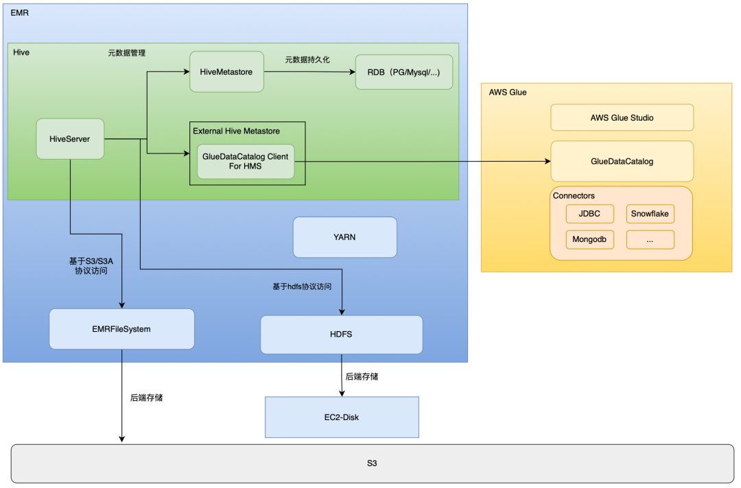 元数据方面可以通过HiveMetastore将元数据存储在RDB数据库中进行元数据管理,也可以通过GlueDataCatalog的方式将元数据存储在glue中来兼容其他的异构数据源。