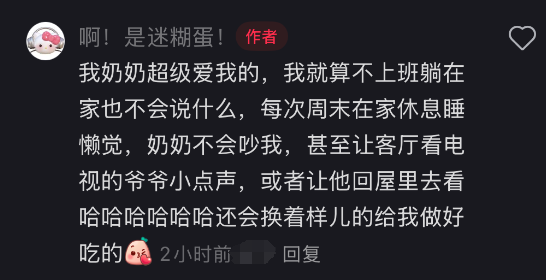 “伺候爷奶,不仅能拿着爷奶分的退休金,还包吃包住、水果管够。上班期间给领导提供情绪价值,领导只会给你画更多饼,但自从当上全职乖孙才懂什么叫双向奔赴——晚上说想吃的东西,第二天一早奶奶就骑着自行车上菜场了。”