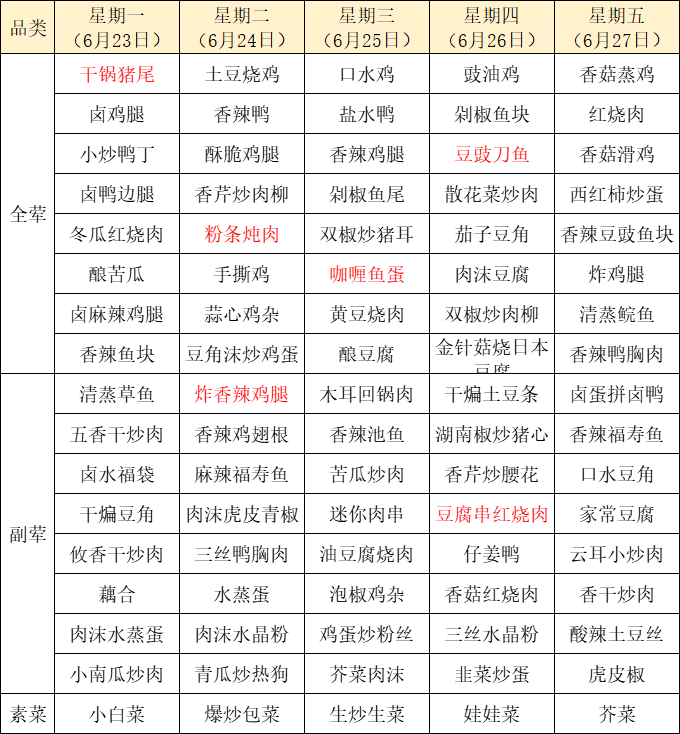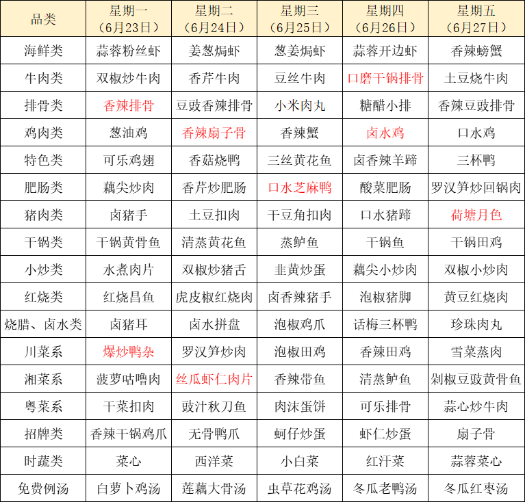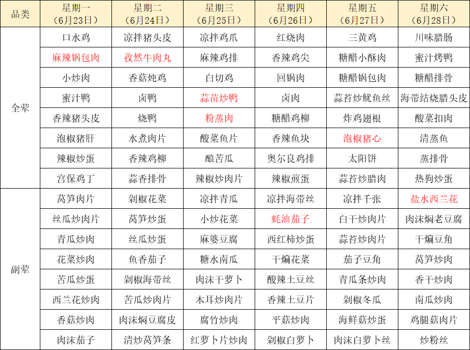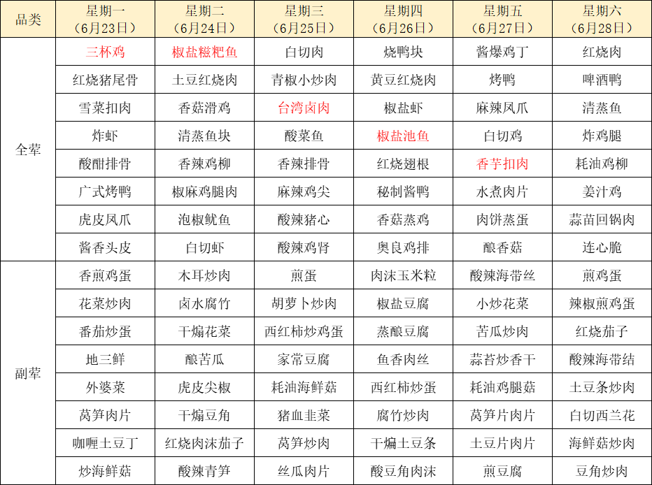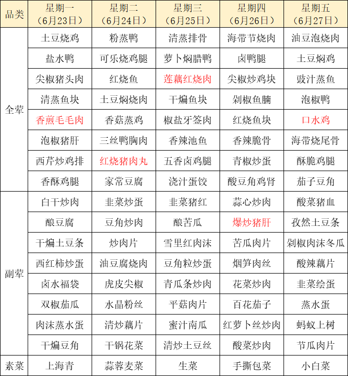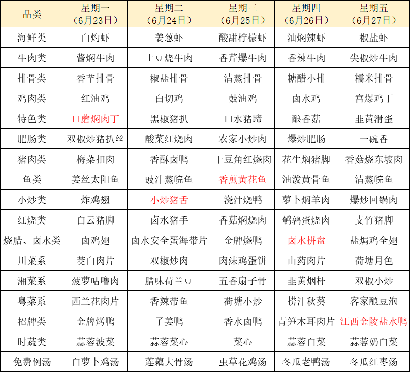 菜单上标红的内容为每周新菜式,皆为我们精心为您准备的美味惊喜噢~因市场及其它不可控因素,有些食材采购不到,可能会出现个别菜品与菜单不一致的情况,还请谅解!