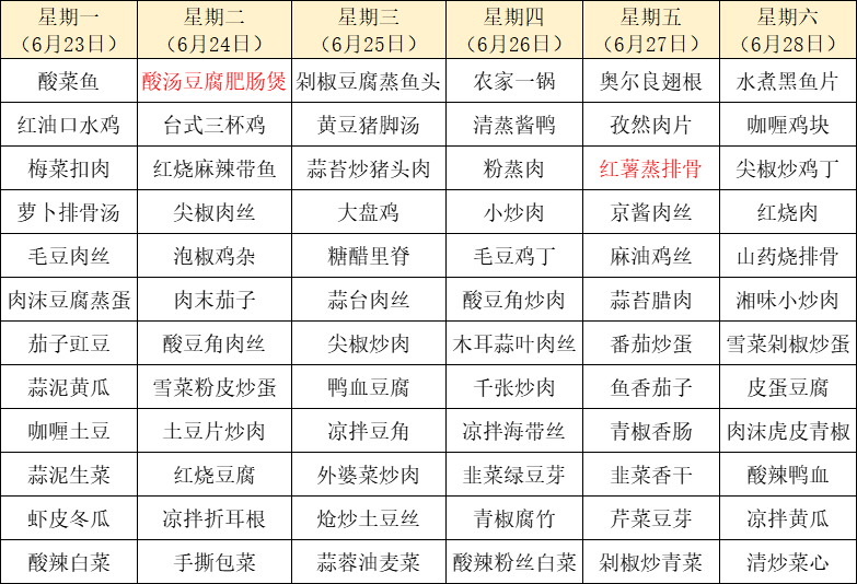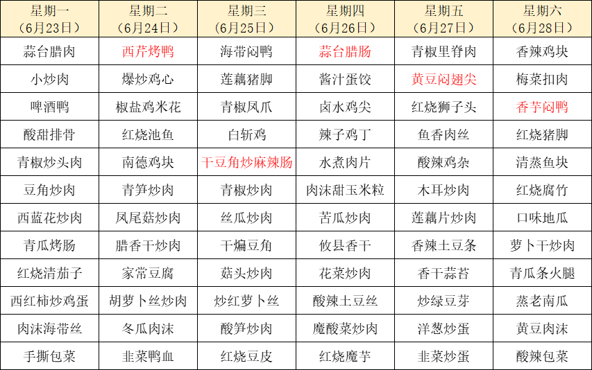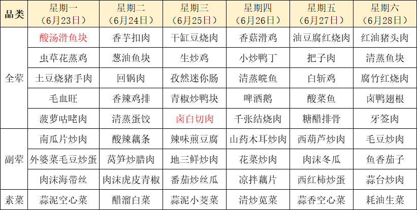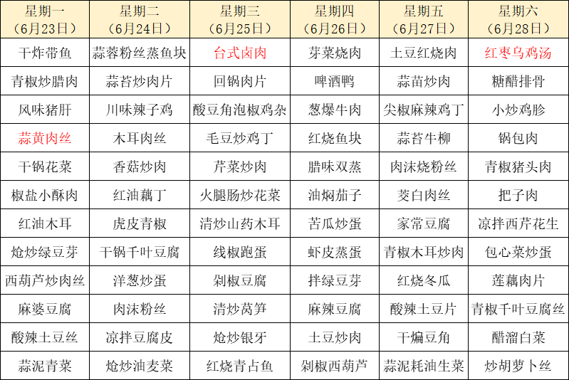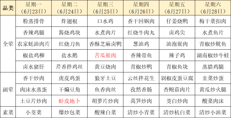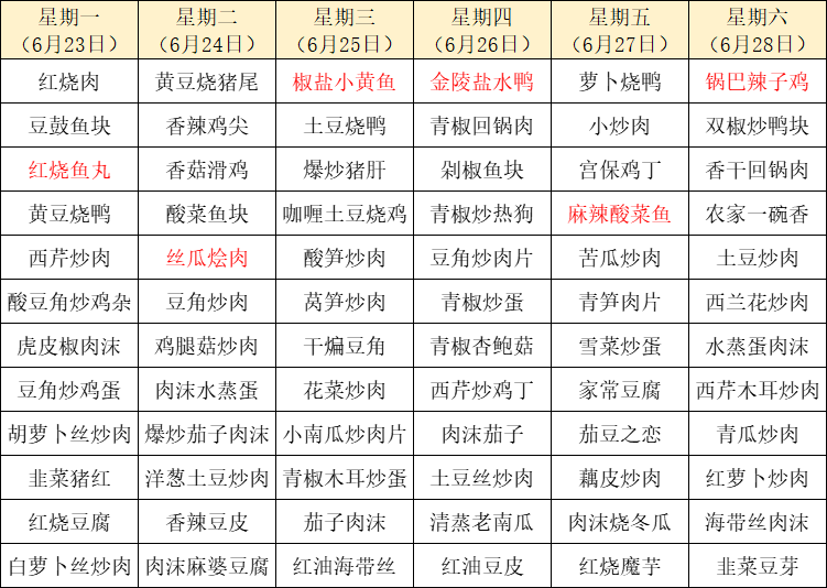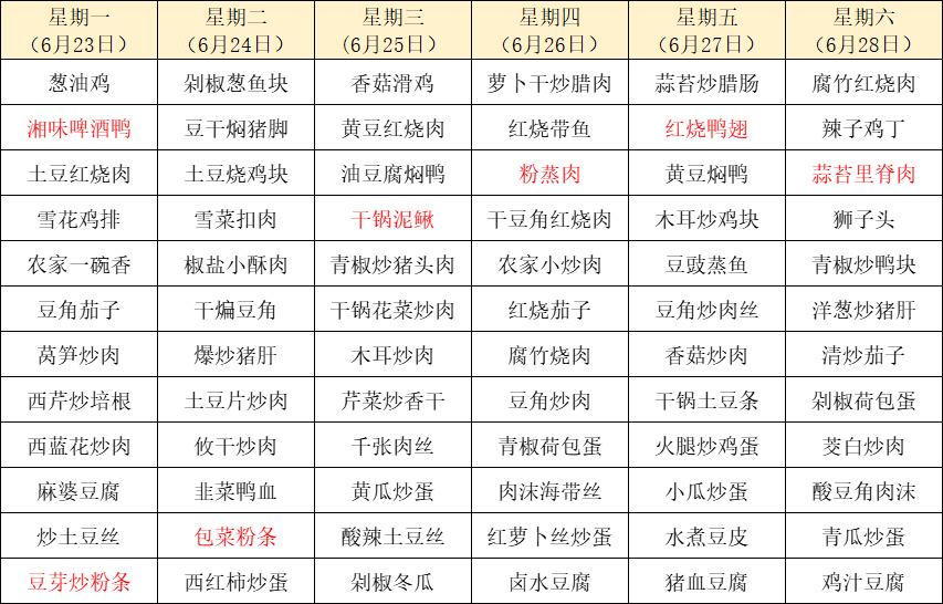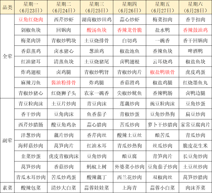 菜单上标红的内容为每周新菜式,皆为我们精心为您准备的美味惊喜噢~因市场及其它不可控因素,有些食材采购不到,可能会出现个别菜品与菜单不一致的情况,还请谅解!