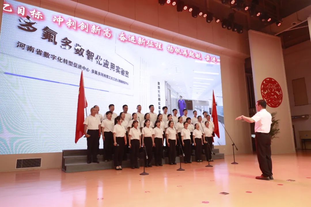 在《氟谷之光》演讲比赛中脱颖而出的优秀选手登台朗诵《红色基因燃信念 氟谷之光暖八方》,字里行间尽显新时代多氟多人的责任与使命;直属党支部以经典民歌《回娘家》表达了对多氟多这个温暖“娘家”的深情厚谊;机关二党支部以三句半形式演绎《干部十条》,讲透规矩与担当;新能源党委与集团团委携手打造的《当青春遇上战火》,沉浸式带领观众回到烽火岁月,再现革命先辈在党旗下用青春点燃希望的壮丽篇章;党员、民兵共同合唱《咱们工人有力量》,以嘹亮的歌声展现新时代产业工人的磅礴力量和奋斗豪情。