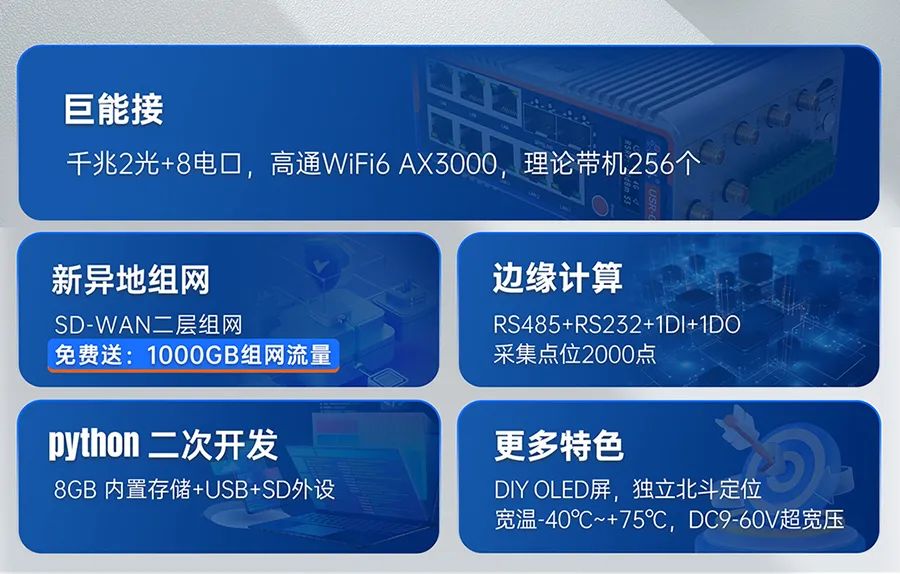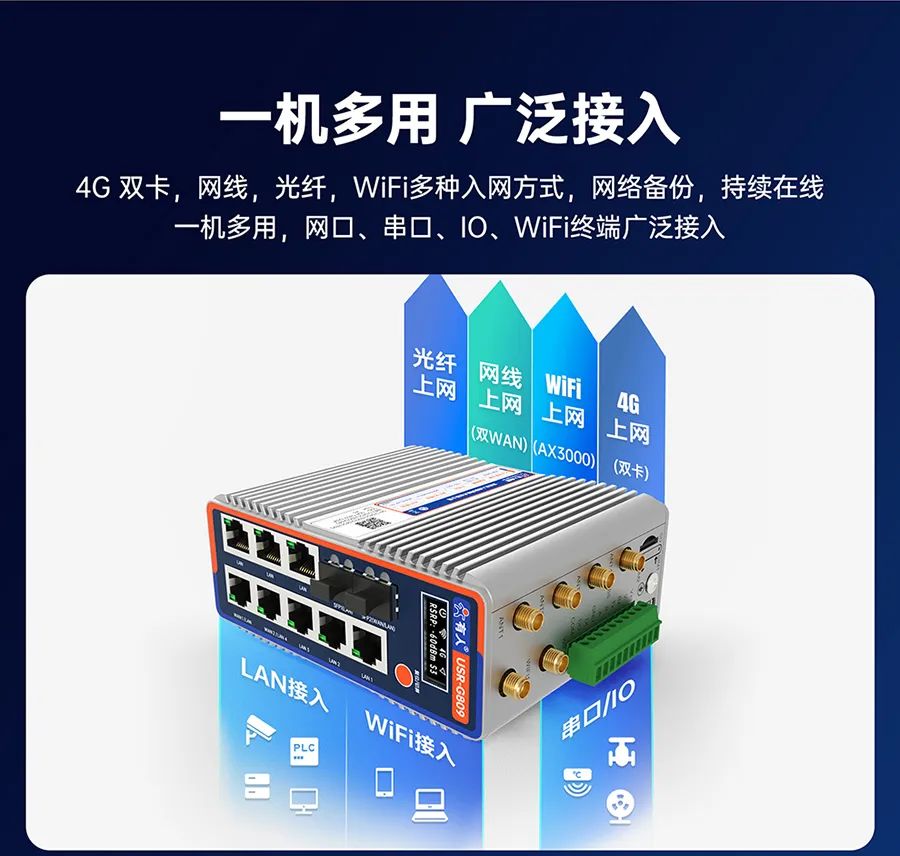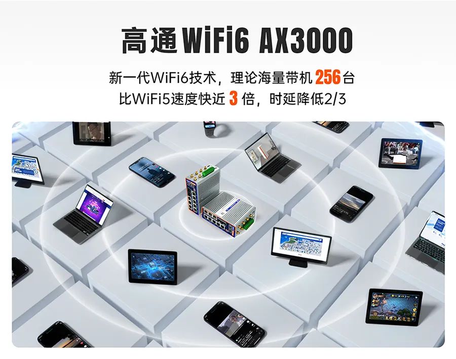 【巨能接的“核心枢纽”】千兆2光+8电口+双串口+IO端子:PLC/摄像头/传感器一机接入;4G双卡+高通WiFi6 AX3000,理论带机256个!
