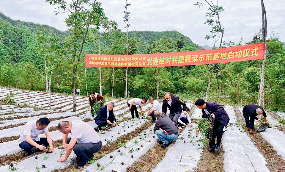 初夏,绵阳市平武县平通羌族乡新桥村的千亩高山蔬菜基地里,党员们正忙着栽种辣椒苗、番茄苗。这片海拔1300多米的土地上,正进行着一场国企与深山羌乡的“双向奔赴”——长虹控股集团旗下佳虹实业有限公司(以下简称“佳虹公司”)党总支与新桥村党总支通过党建结对共建,搭建起“组织联建、产业联创、资源联动”的桥梁。