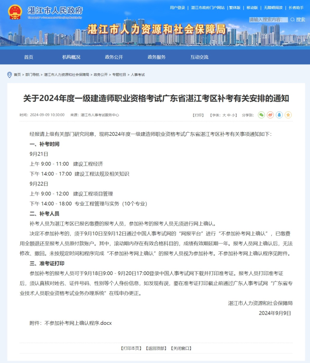 参加补考的报考人员可于9月18日9:00-9月20日17:00登录中国人事考试网下载并打印准考证。报考人员打印准考证后,须认真核对姓名、证件号码、性别等个人身份信息,如发现有误,要在准考证打印截止前通过各地人事考试网在线申办更正。