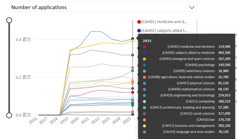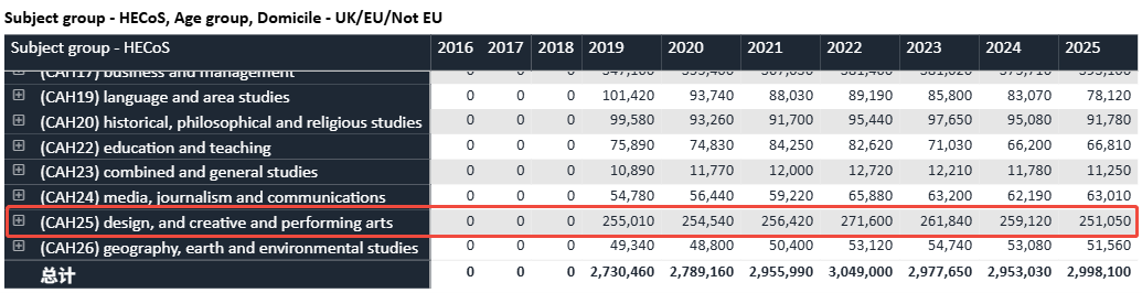 根据最新数据,尽管设计、创意与表演艺术领域的申请数量较去年减少了8,070份,但其受欢迎程度依然强劲,位列所有专业方向的第4位,甚至超越了部分理工类专业。