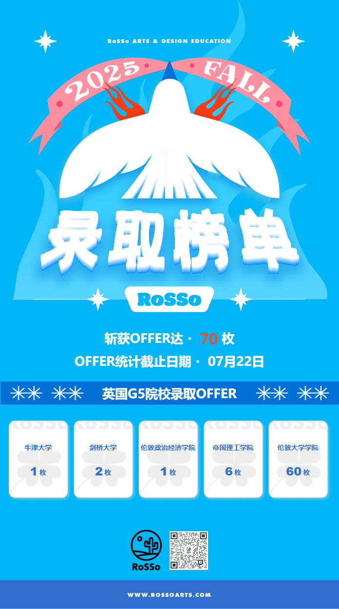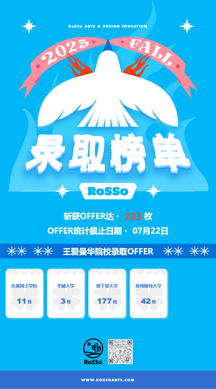 本次放榜RoSSo学员揽获“王爱曼华”Offer近240枚,电影、交互、建筑、平面、时尚管理等王牌专业全线开花!