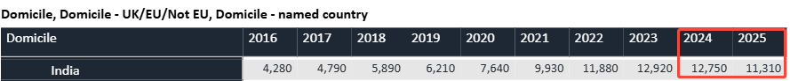 印度学生提交了11,310份申请,较去年减少了1,440份。美国学生则提交了7,930份申请,较去年增加了近1,000份。