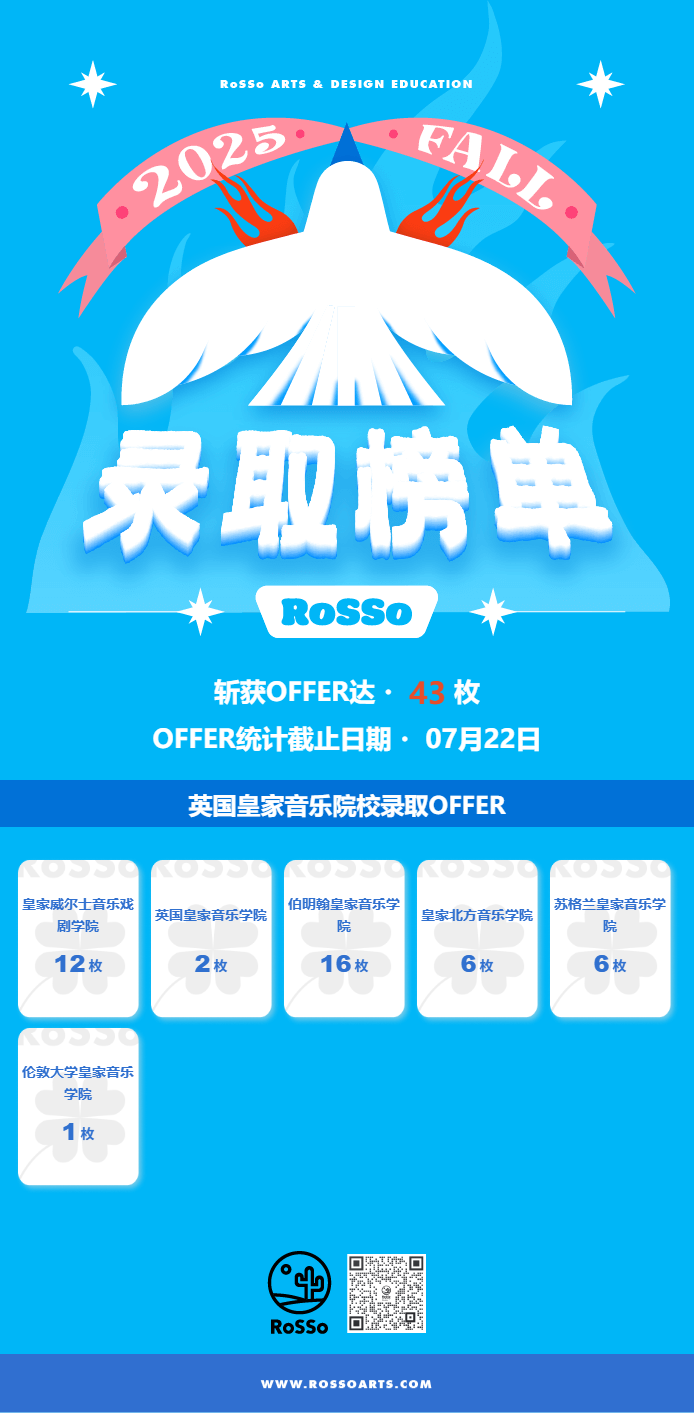 25Fall,RoSSo MUSIC再次取得了耀眼的战果!已经斩获1枚大英皇RAM、2枚小英皇RCM,更有伯明翰皇家音乐学院16枚,以及皇家威尔士音乐与戏剧学院12枚、皇家北方音乐学院6枚、苏格兰皇家音乐学院6枚!