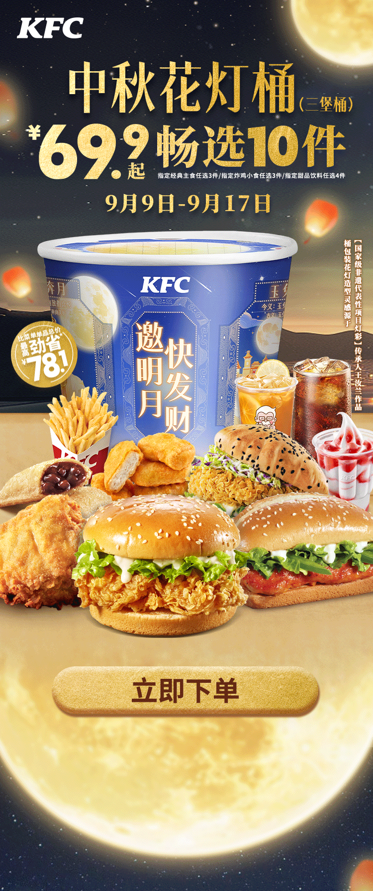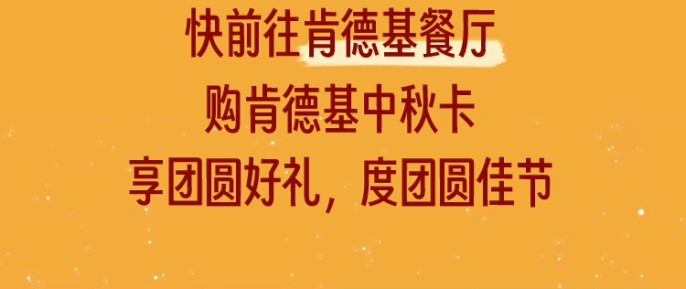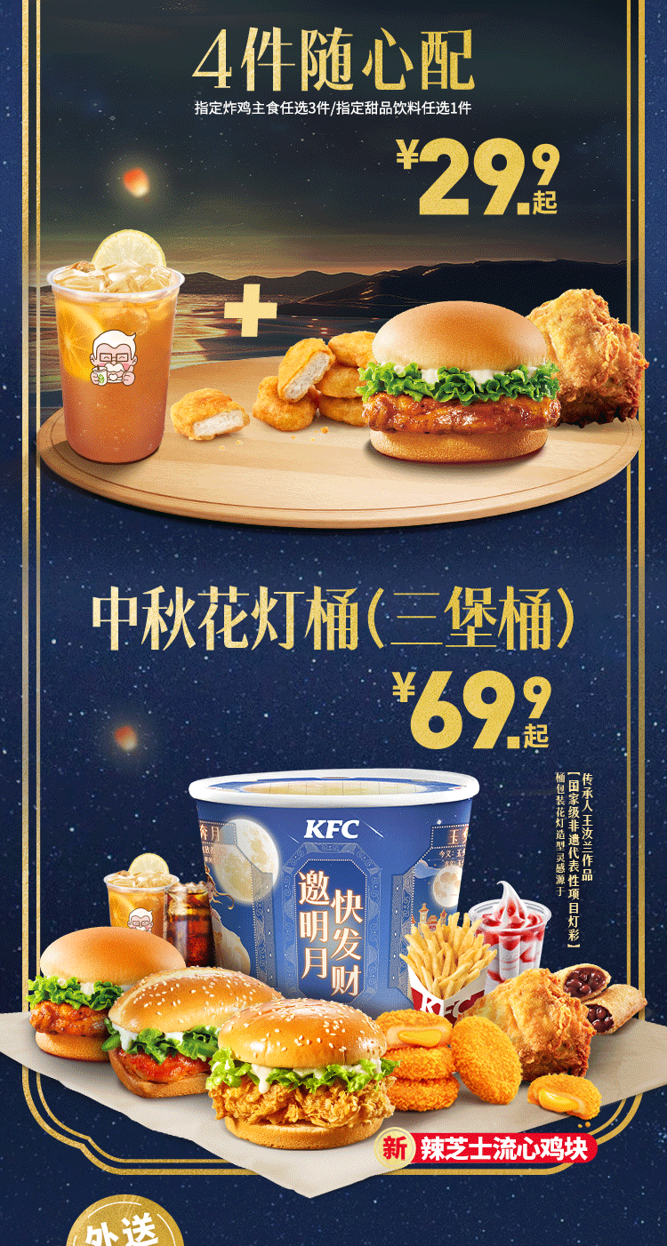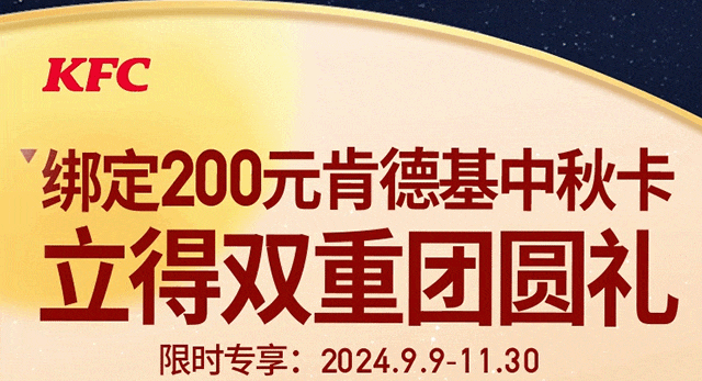中秋花灯桶和中秋四味小食拼盘自2024年9月15日起至2024年9月17日供应。中秋4件随心配自2024年9月16日起至2024年9月17日供应。活动期间,可以指定金额在指定品类中任选指定数量的指定产品,详情以菜单显示为准。活动渠道:堂食-柜台点餐、堂食-自助点餐机、堂食-自助点餐到店自取。活动时间:9:30-23:00。活动地区:全国。堂食具体供应时间以餐厅实际营业时间为准,仅限有此产品供应的部分肯德基餐厅,交通枢纽、旅游景区、西藏自治区的餐厅及精选餐厅等部分餐厅除外,具体情况以餐厅餐牌公示为准。除推广产品外,其他物品仅做装饰目的,图示内容仅供参考。产品、周边、玩具及包装以实物为准。不与其他优惠共享。堂食、肯德基宅急送自有渠道、第三方外卖平台外送渠道、甜品站、团购渠道、企业送渠道及其他渠道的产品组合、价格及优惠活动,以各渠道页面展示为准。肯德基周末疯狂拼活动自2024年9月1日起至2024年9月29日,仅限双休日。活动期间,选购指定区域活动产品满足相应数量,则所选购活动产品可享相应的套餐价格。指定区域产品可选范围以点餐渠道中的菜单内容及相关说明为准。辣芝士流心鸡块自2024年9月15日起上市,共限量91万份,售完即止。活动渠道:堂食-柜台点餐、堂食-自助点餐机、堂食-自助点餐到店自取、外送-肯德基超级APP外送到家、外送-肯德基宅急送美团外卖平台、外送-肯德基宅急送饿了么外卖平台、外送-肯德基宅急送企业送、外送-肯德基+微信小程序、外送-肯德基支付宝小程序。活动时间:9:30-20:00。活动地区:全国。堂食具体供应时间以餐厅实际营业时间为准,仅限有此产品供应的部分肯德基餐厅,交通枢纽、旅游景区、西藏自治区的餐厅及精选餐厅等部分餐厅除外,具体情况以餐厅餐牌公示为准;外送部分送餐区域不供应此产品,详情以输入地址后显示的菜单及送餐时间为准。除推广产品外,其他物品仅做装饰目的,图示内容仅供参考。产品、周边、玩具及包装以实物为准。活动自2024年9月14日至9月17日。活动期间,肯德基WOW会员可在“我的卡包”查看到店专享“指定冰淇淋同款买一送一(堂食&肯德基甜品站&K咖啡速取窗产品可选范围:原味花筒、绿色心情奶乎乎花筒(单旋)、绿色心情奶乎乎圣代(单旋)、绿色心情奶乎乎K飓风、湖盐花筒(单旋)、湖盐圣代(单旋)、荔枝滇红茶味花筒(单旋)、荔枝滇红茶味圣代(单旋)、经典草莓圣代、超糯糯麻薯草莓圣代、K飓风(奥利奥),11选1)”、外送专享“指定冰淇淋同款买一送一(肯德基宅急送产品可选范围:经典草莓圣代、绿色心情奶乎乎圣代(单旋)、湖盐圣代(单旋)、荔枝滇红茶味圣代(单旋)、超糯糯麻薯草莓圣代,5选1)”。同一用户在活动期限内每日可领取2张电子优惠券,每张电子优惠券每日仅限使用1次。电子优惠券具体使用规则详见“我的卡包”券说明。活动地区:全国。活动期间,会员凭到店专享优惠券自助点餐到店自取或凭外送专享优惠券在肯德基宅急送订餐,以菜单单品价购买指定产品1份,即可得同款产品1份。肯德基宅急送渠道如遇经典草莓圣代、绿色心情奶乎乎圣代(单旋)、湖盐圣代(单旋)、荔枝滇红茶味圣代(单旋)、超糯糯麻薯草莓圣代售罄,凭券可替换为原味圣代(黑糖珍珠酱)。绿色心情奶乎乎冰淇淋系列产品自2024年8月17日起在全国范围内陆续上市,绿色心情奶乎乎花筒(单旋)全国限量120万个,绿色心情奶乎乎圣代(单旋)全国限量50万个,绿色心情奶乎乎K飓风全国限量7万个,售完即止。湖盐花筒自2024年7月8日在全国范围内陆续上市,湖盐花筒(单旋)全国限量200万个,售完即止。湖盐圣代自2024年8月2日在全国范围内陆续上市,湖盐圣代(单旋)全国限量50万个,售完即止。荔枝滇红茶味冰淇淋系列产品自2024年5月13日在全国范围内陆续上市,荔枝滇红茶味花筒(单旋)全国限量180万个,荔枝滇红茶味圣代(单旋)全国限量80万个,售完即止。不同餐厅的价格不同,具体以各餐厅餐牌公示的实际价格为准。同一ID、同一设备、同一手机号、同一支付账户、同一取餐联系电话、同一送餐联系电话、同一送餐地址,均视为同一用户。对于任何通过不正当手段(包括但不限于作弊、通过机器行为等方式恶意刷单)参加活动获取权益或者不符合活动规则的行为,我们将在不事先通知的前提下取消该用户参与活动的资格和已获得的相应权益。堂食具体供应时间以餐厅实际营业时间为准,仅限有此产品供应的部分肯德基餐厅,交通枢纽、旅游景区、西藏自治区的餐厅及精选餐厅等部分餐厅除外,具体情况以餐厅餐牌公示为准;外送部分送餐区域不供应此产品,详情以输入地址后显示的菜单及送餐时间为准。除推广产品外,其他物品仅做装饰目的,图示内容仅供参考。产品、周边、玩具及包装以实物为准。不与其他优惠共享。2024年9月15日至2024年9月17日,用户登录肯德基WOW会员后,通过指定活动渠道购买任一肯德基中秋系列套餐产品:中秋花灯桶(三堡桶)/中秋花灯桶(双堡桶)/中秋四味小食拼盘/中秋4件随心配(2024年9月16日至2024年9月17日供应),完成订单后(外送餐品需送达后)即视为参与活动,有机会获得携程电子礼品卡1份(价值1000元,共300份)。活动渠道:堂食-自助点餐到店自取、外送-肯德基超级APP外送到家、外送-肯德基+微信小程序、外送-肯德基支付宝小程序。活动时间:9:30-23:00,具体以餐厅实际营
