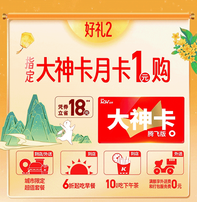 5、1张1元购指定大神卡月卡优惠券(自领取日起60天内使用有效;仅限在肯德基超级APP或肯德基+小程序的付费会员主题页购买指定大神卡月卡时可用)