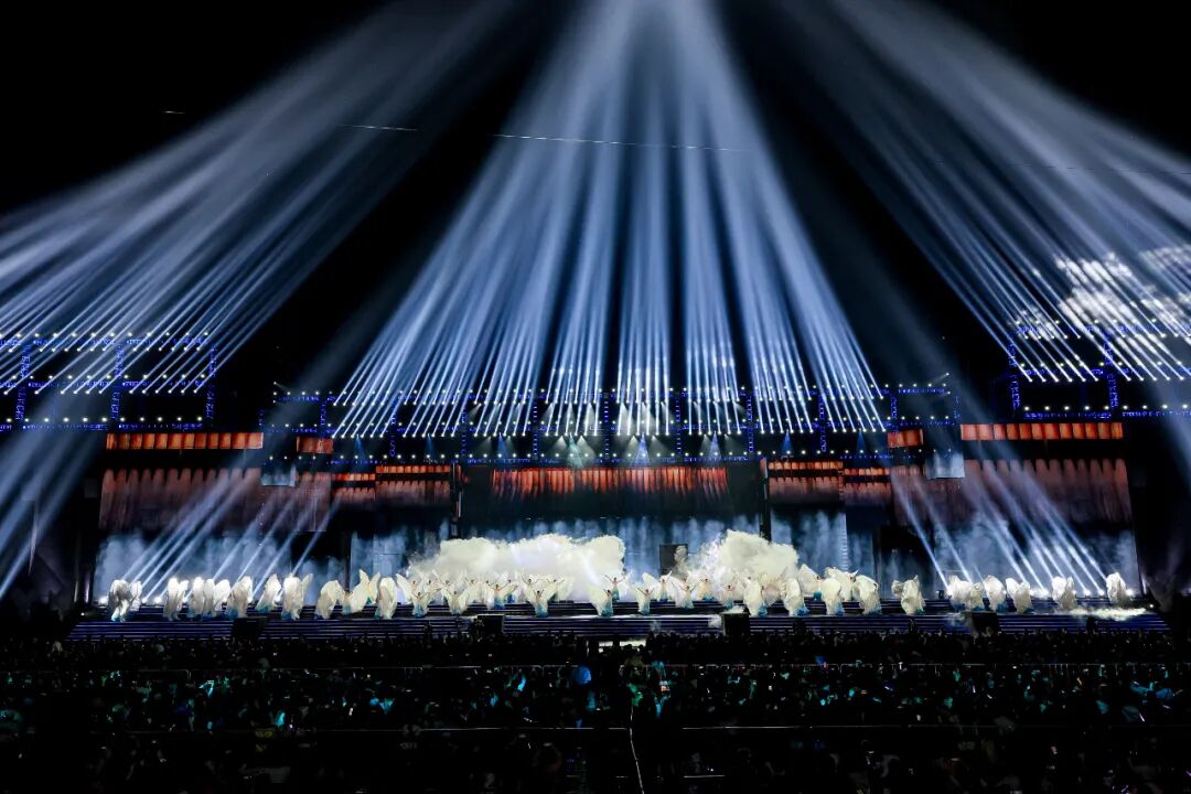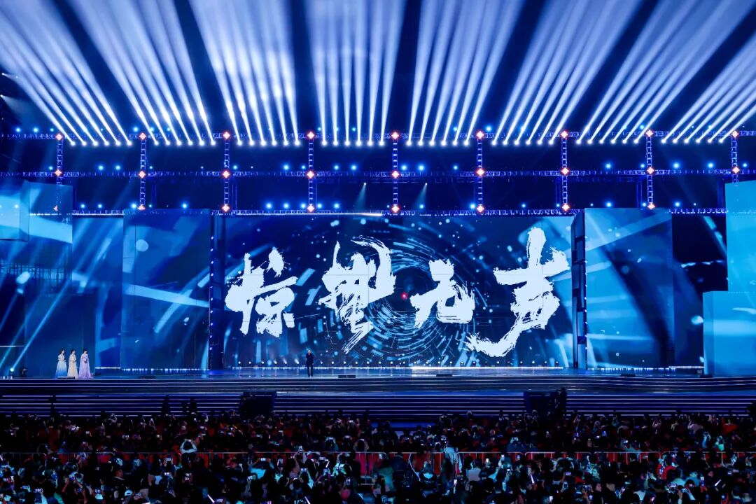 本届晚会整体舞美以简约立体造型,重构宜昌地标长江大坝和宜昌“一半山水、一半城”的视觉表达。开场通过视频和特效装置,营造出三峡大坝开闸的壮观视听洪流,极具震撼冲击力。