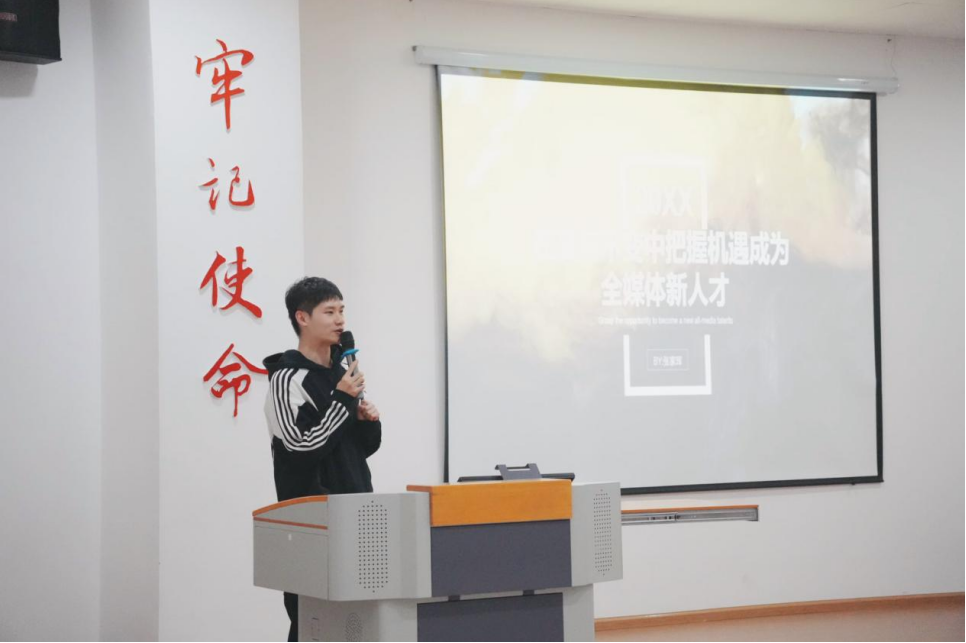 李小拣老师进行专业介绍,她围绕专业培养目标、课程设置、实践教学、就业前景等方面进行了深入浅出的讲解,让新生们对即将开始的学习生活有了更清晰的认识。董东潮教授分享了自己多年的从业经验,从“播、说、演、诵”四个方面讲解专业基本功,鼓励新生们珍惜大学时光,勇于探索,敢于创新,努力成为行业内的佼佼者。全媒体方向张家珲老师,讲解了全媒体方向的授课课程及培养模式,并与学生展开积极的交流互动;有声语音应用方向曹萌萌老师,讲解了目前少儿口才教师的市场需求,提醒学生们要注意未来四年的学习和职业规划。