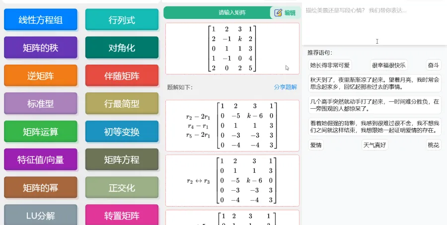 学数学,有线性代数计算器,同时支持矩阵计算、线性方程组、行列式……