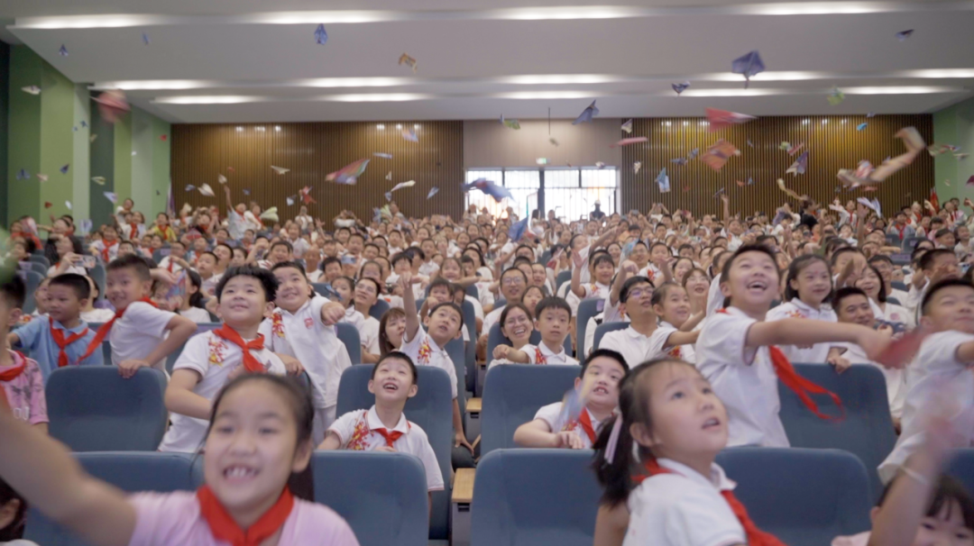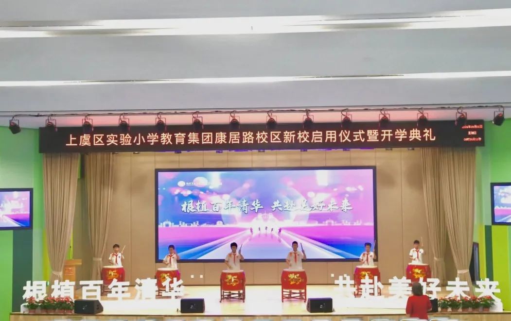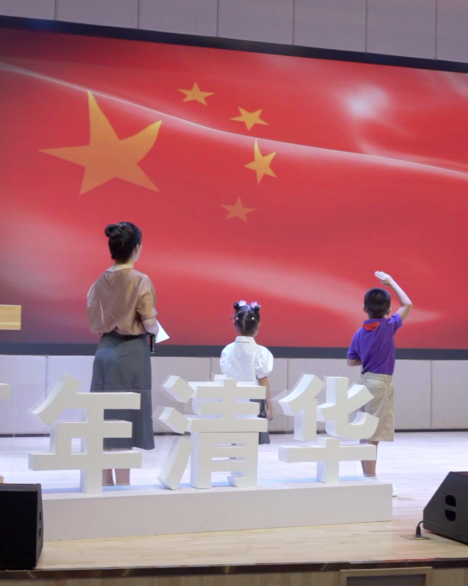在激越的鼓点声中,家长们牵着孩子们的手,走进明德剧院,兴致勃勃地观看了“根植百年清华 共赴美好未来”建校视频。