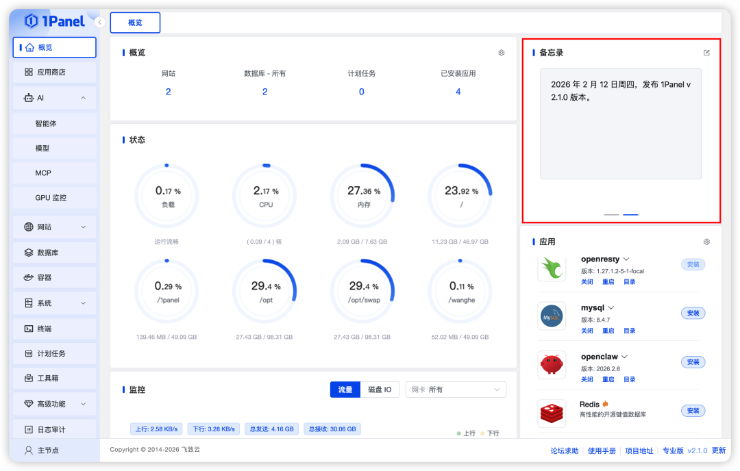 1Panel v2.1.0版本在“概览”页面新增了备忘录功能。用户可以直接在面板内记录重要事项、变更说明与运维备注,减少信息分散带来的沟通成本。通过备忘录,团队成员可以更快速地了解当前环境的关键状态与处理背景,便于后续维护与协作交接。
