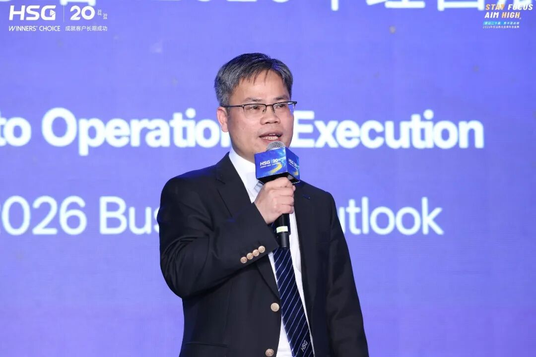 随后,宏山激光轮值CEO Ricky Wu回顾了2025年公司整体发展情况,在组织变革与战略聚焦下,公司在全球业务布局、海外市场拓展、产品创新与交付能力等方面取得重要突破,其中海外市场占比60%,中国5万美金以上出口机型居行业第一。Ricky Wu在会上重点指出,宏山激光提前完成对供应商伙伴的年度结算付款,彰显公司实现长期稳健运营,与合作伙伴共生共赢的承诺。面向2026年,宏山将聚焦产品创新、品牌竞争力、客户价值创造及组织与人才能力提升,推动由规模扩张向高质量增长跃升。