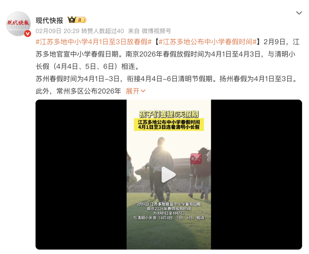 。江苏的孩子们今年可有福了!跟上浙江、四川等地春秋假的脚步,江苏宣布从2026年春季学期开始,全省义务教育阶段学校各年级推行中小学春秋假制度。江苏各市纷纷官宣,今年跟着清明假期,共有4月1日至4月6日整整6日连休!