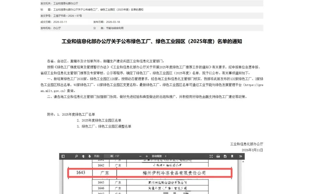 近日,国家工业和信息化部正式发布2025年度绿色工厂及绿色工业园区名单。梅州伊利冷冻食品有限责任公司(以下简称梅州伊利)凭借其在绿色制造领域的系统性实践与卓越成效,成功荣膺国家级“2025年度绿色工厂”荣誉称号。这不仅是对梅州伊利长期践行可持续发展理念、深耕绿色制造的权威认可,也是对其在环境保护责任履行与创新驱动发展方面领先地位的充分肯定。