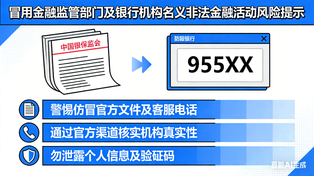 近期,个别不法分子冒用金融监管部门及银行机构名义开展非法金融活动,严重扰乱金融秩序,侵害人民群众财产安全。为提醒广大金融消费者提升防范意识和识别能力,远离非法金融活动,监管部门提示如下: