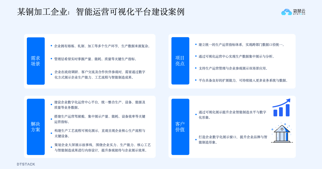 某铜冶炼企业:数字化运营中心建设该企业生产环节多、数据来源复杂,且缺乏统一的经营指标视图和对外展示平台。为此,为其打造数字化运营中心,整合生产、设备、能源、质量数据,构建统一指标平台,实现数据口径标准化;通过运营驾驶舱实时分析能耗、产量、设备效率等指标,结合可视化手段直观展示工艺流程和核心产线;专门设计大屏展示内容,适配参观接待、政府调研等场景。项目亮点在于实现了跨部门数据统一和指标标准化,同时兼顾运营管理和企业展示两大场景,不仅提升了企业内部经营管理水平,还打造了数字化展示名片,显著提升了智能制造形象。