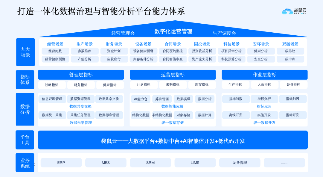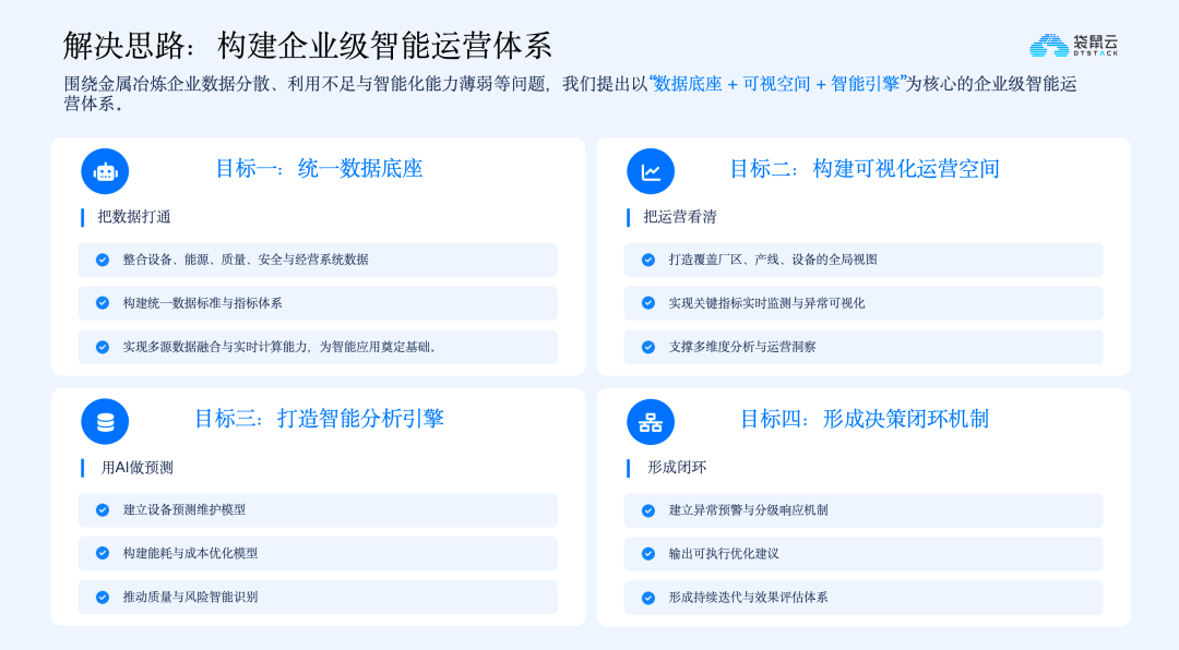 针对行业痛点与发展趋势,构建企业级智能运营体系成为冶炼企业数字化升级的核心思路,该体系以“数据底座、可视空间、智能引擎”为核心,通过四层建设目标,实现数据整合、运营可视、智能分析与决策优化的全流程闭环,让数据真正服务于生产运营。