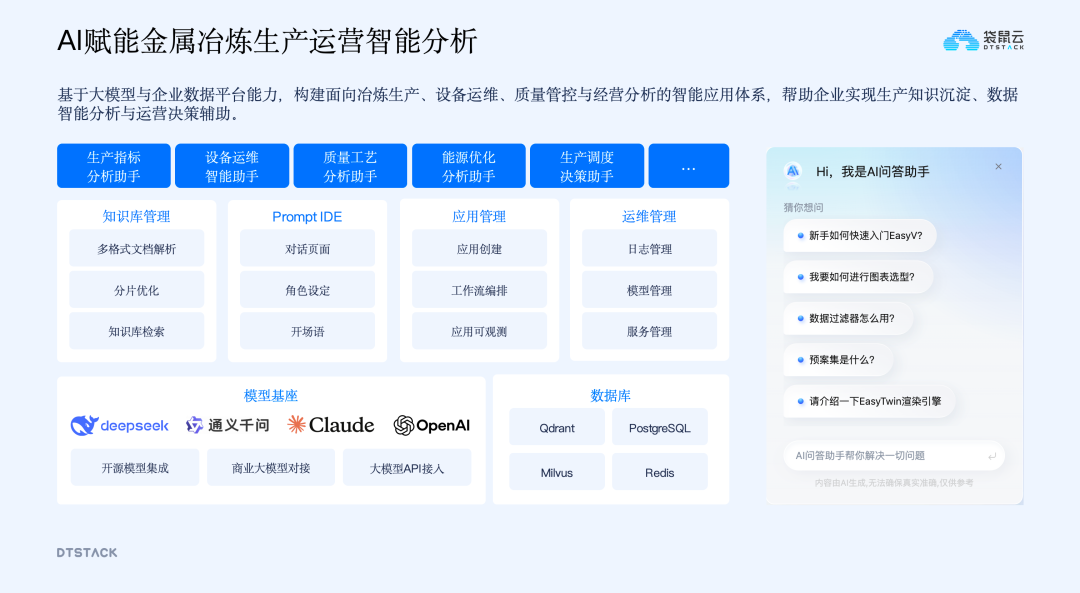 全岗位AI助手落地将AI能力拆解到各业务岗位,为生产、设备运维、质量工艺、能耗管理、生产调度等岗位配备专属AI助手,让智能分析能力覆盖生产运营全流程,每个岗位都能借助AI技术提升工作效率和决策准确性。