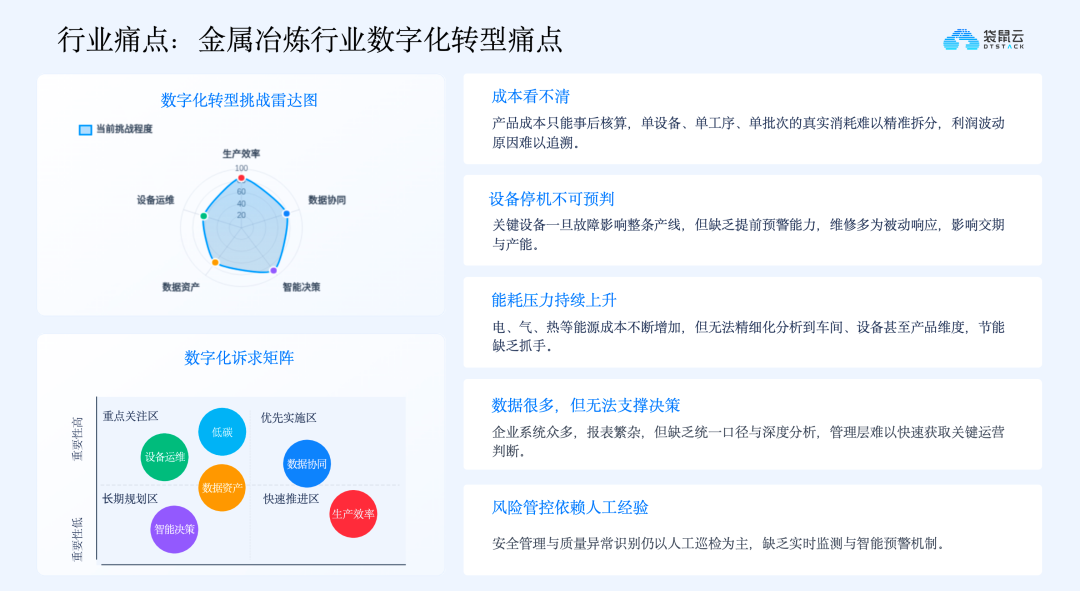在数字化转型过程中,冶炼企业虽完成了一定的系统建设,但仍面临诸多现实痛点,核心问题在于数据增长与管理能力升级不同步,无法将数据转化为实际的运营能力。