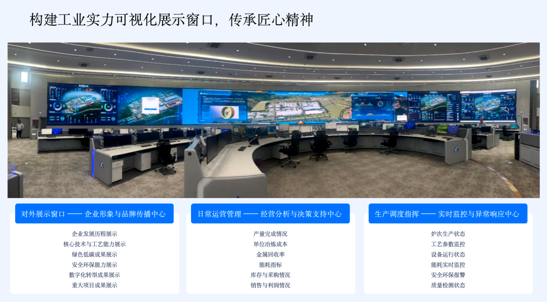 数字化运营中心建设数字化运营中心是企业数字化能力的集中体现,承担着对外展示窗口、日常经营管理中心、生产调度与指挥中心三大核心职能。作为展示窗口,通过数字孪生展示企业发展历程、绿色低碳成果等,打造数字化名片;作为管理中心,实时呈现产量、单位成本、能耗等指标,支持多维度分析,助力管理层快速决策;作为调度中心,实时监控炉况、工艺参数、设备状态,实现异常实时预警,支撑生产现场高效调度。