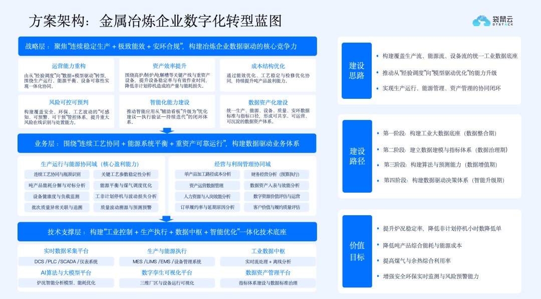 冶炼行业数字化升级的核心是打造数据驱动的运营能力,整体蓝图从战略层、业务层、技术层三个维度出发,围绕“连续稳定生产、极致能效优化、安全环保合规”三大核心目标展开,实现企业全维度的数字化升级。