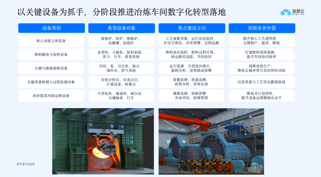 以关键设备为抓手的分阶段数字化转型冶炼企业是设备驱动型生产体系,设备状态直接影响产量、质量、能耗和安全,因此以关键设备为抓手分阶段推进数字化转型是务实选择。重点围绕五类设备展开:核心冶炼主体设备(熔炉、电解槽等)、物料输送加料设备(皮带机、配料系统等)、能源保障公共辅助设备(风机、空压机等)、质量检测设备(在线分析仪、传感器等)、高价值高风险运维设备(大型电机、液压系统等),抓住关键设备就抓住了生产运营的核心。