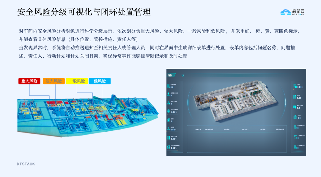 安全风险数字化管控针对冶炼行业高温高压、有毒气体等风险点多的特点,通过数字孪生系统实现安全风险的全流程管控:一是让风险看得见,在厂区三维场景中用不同颜色标识风险等级,直观展示风险分布;二是让风险分得清、查得到,点击风险点即可查看风险位置、类型、管控措施、责任人等详情;三是实现风险闭环处理,风险识别后自动触发预警并推送责任人,生成整改任务并记录全流程,直至问题关闭,让安全风险从“看不见、管不住”变为“可视化、可管控”。