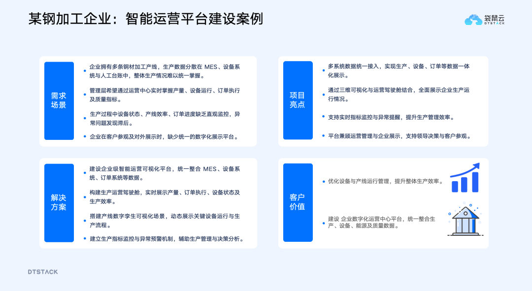 某钢材加工企业:智能运营可视化平台建设该企业此前面临数据分散、生产信息缺乏实时联动、对外展示窗口缺失等问题。基于此,为其搭建企业级智能运营可视化平台,打通MES、设备和订单系统,实现数据统一接入与集中展示;构建运营驾驶舱,实时呈现产量、订单执行、设备状态等关键指标;结合数字孪生技术实现核心设备动态可视化,并建立指标监控和异常预警机制。项目上线后,管理层实现生产状态实时掌控,决策响应更及时;生产过程从事后发现转为事中预警,运营效率大幅提升;平台同时成为企业对外展示的数字化窗口,提升了企业品牌形象。