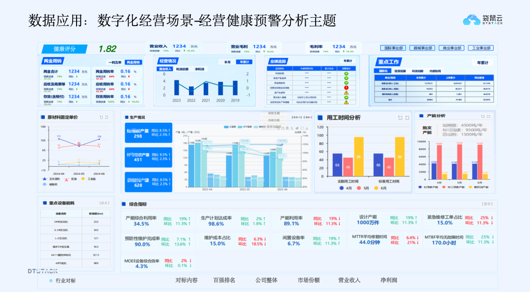 经营健康预警分析通过构建经营健康分析主题,整合分散在各系统的经营数据,形成企业整体健康评分(基于营业收入、毛利率、库存周转率等关键指标),实时监控企业经营状况。同时,构建统一的数据治理体系,统一指标口径和数据来源,确保经营数据可追溯、可解释,让管理层在统一视图中快速掌握经营状态,及时识别经营风险。