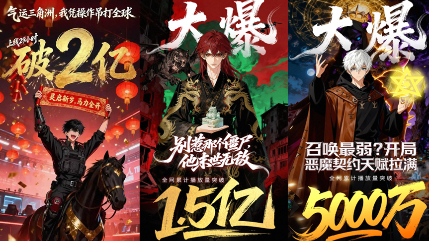 这一工业化生产能力已在爆款中得到验证:今年春节档,仅3人团队耗时5天制作的《气运三角洲,我凭操作吊打全球》,上线29小时播放量突破2亿,连续登顶多个平台漫剧榜单榜首;同期新作《我在惊悚游戏开诊所》《吞噬进化:从蚂蚁吃到神明》也跻身漫剧日榜Top30。