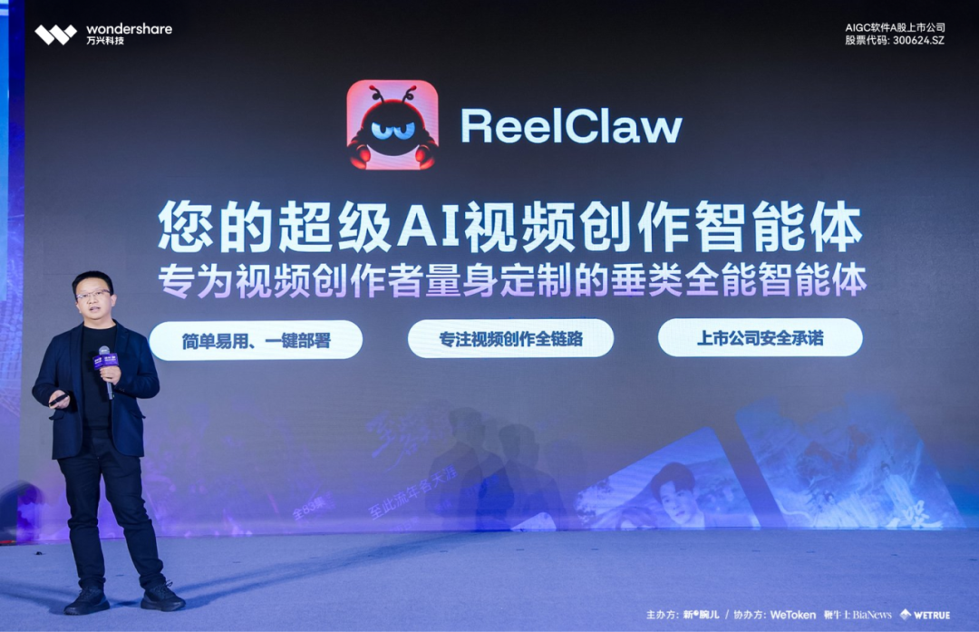 大会现场,万兴科技重磅官宣:全球首个视频创作全链垂类智能体——ReelClaw即将上线。ReelClaw基于OpenClaw开源架构并创新性采用“主子Agent”协同架构,支持一键部署、一键解锁从创意到成片的全链路音视频创作,是专为以个人博主、AI漫剧制作者、影综二创博主、Vlog创作者、切片/信息流制作者等互联网泛C视频内容创作者为主的用户定制打造的“垂类全能智能体”,助力其打造随身“数字班底”,全方位提升创作效能。