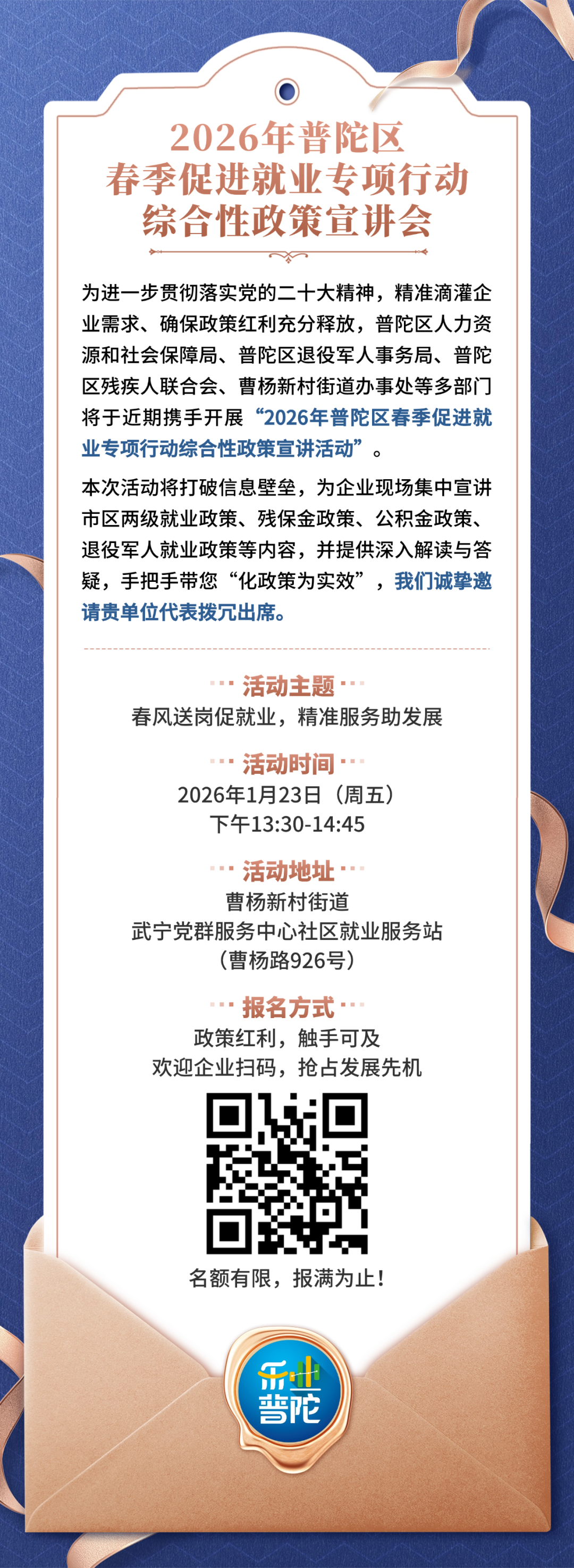 为进一步贯彻落实党的二十大精神,精准对接企业需求、确保政策红利充分释放,由北京宜生无忧科技有限公司支持,上海市普陀区人力资源和社会保障局、上海市普陀区退役军人事务局、上海市普陀区残疾人联合会、上海市普陀区人民政府曹杨新村街道办事处等多部门将联合开展“2026年普陀区春季促进就业专项行动综合性政策宣讲活动”。