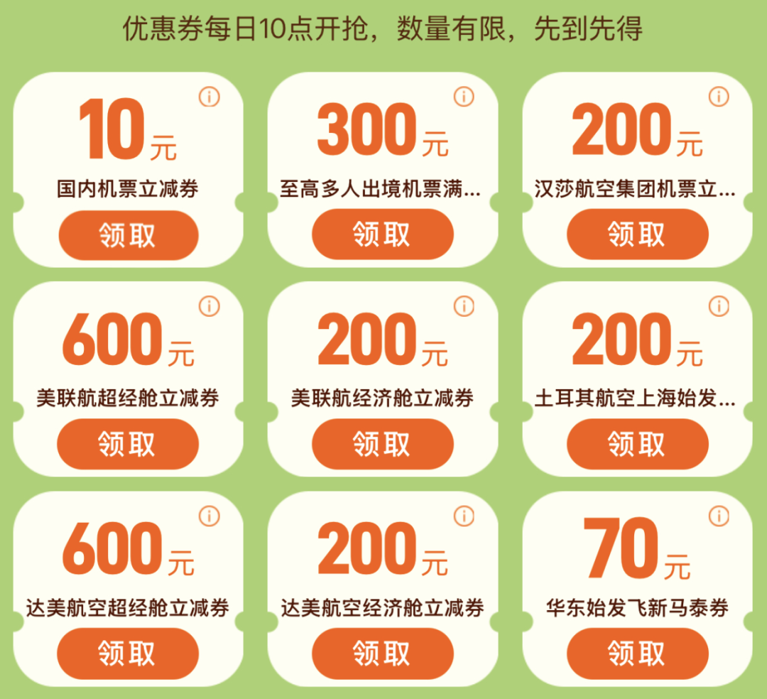 ⏰即日起-3.31,每天10点冲超多国际机票券!多人出境至高减300元/美联航&达美航空 超经舱600元/经济舱200元立减券/汉莎航空200元立减券/土耳其航空200元立减券