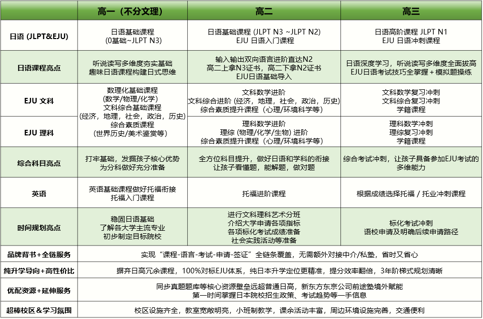 高二: 文理分班,精准发力。文科、理科、艺术分班教学,针对EJU考试内容进行专项突破。同时,结合日本大学录取要求,补充社会实践活动,全面提升竞争力。