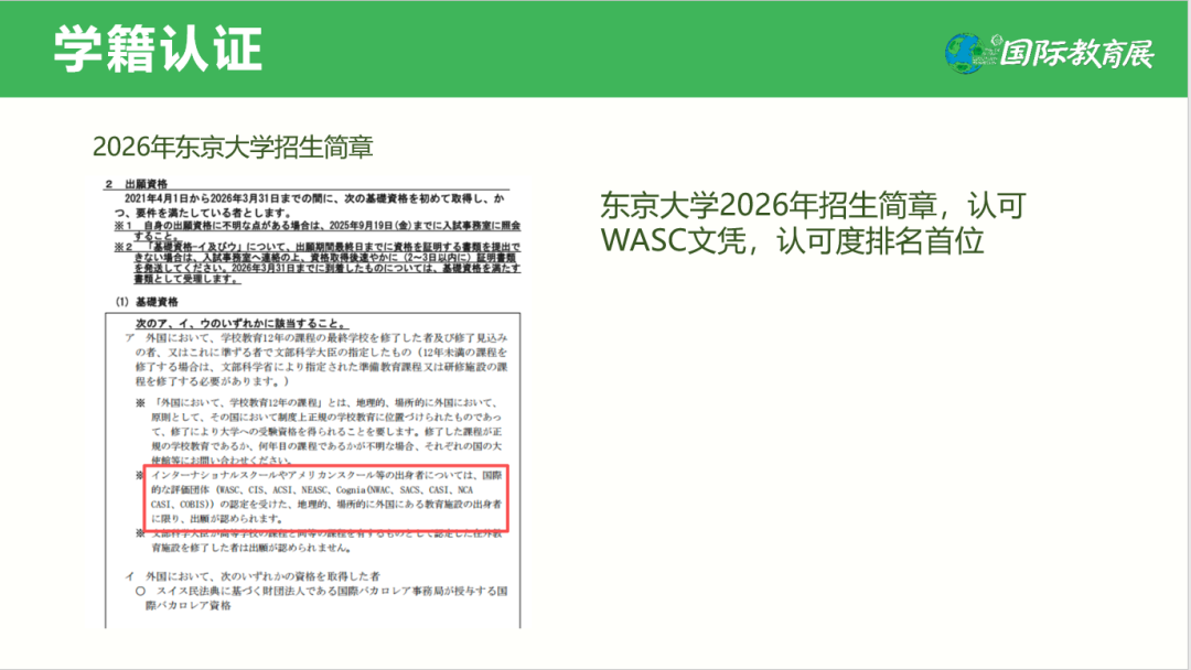 2026年东京大学招生简章中,明确将WASC文凭列为认可度首位。 这意味着,孩子拿到的毕业证和成绩单,是通往包括东大在内的世界顶尖名校的“硬通货”。