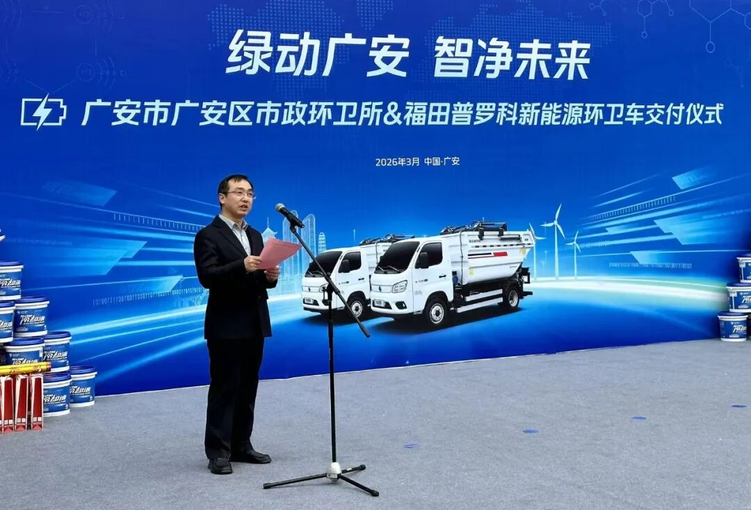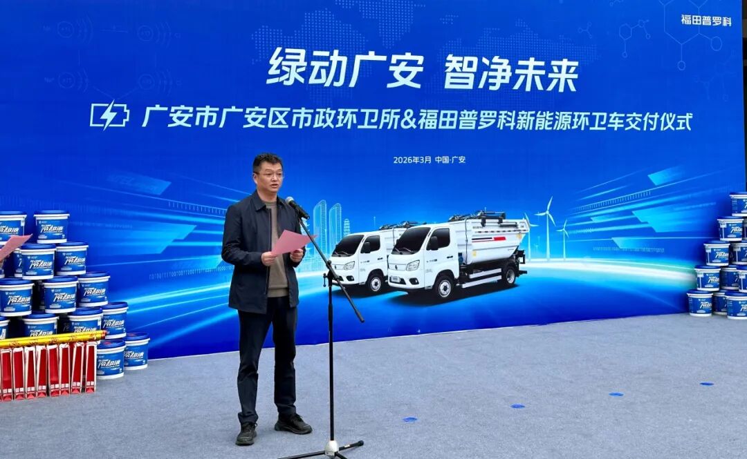 3月18日上午,以“绿动广安 智净未来”为主题的广安市广安区市政环卫所&福田普罗科新能源环卫车交付仪式在广安隆重举行。此次交付既是福田普罗科助力地方环卫装备绿色升级的重要行动,更是政企携手推动城市环境治理向低碳化、智能化迈进的关键一步。