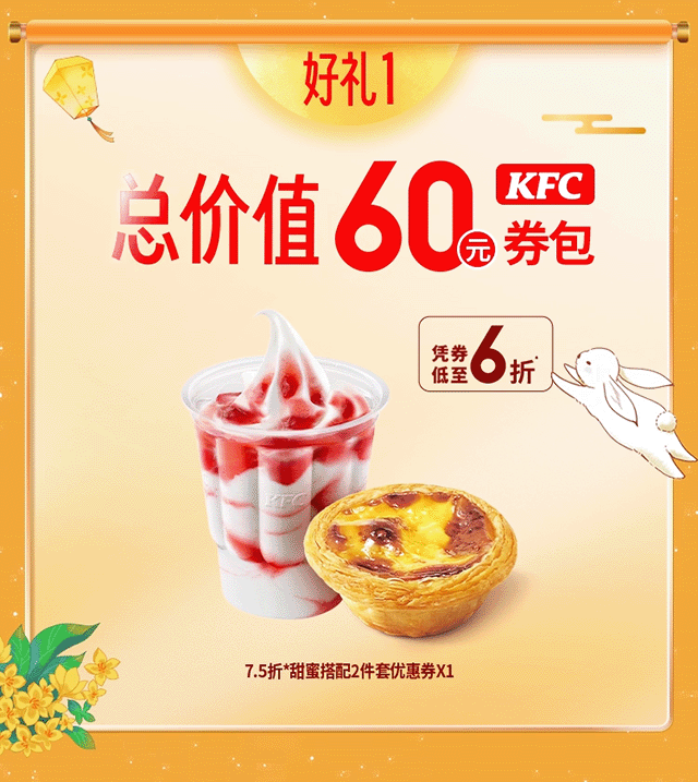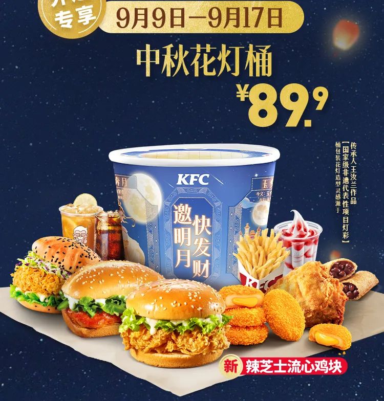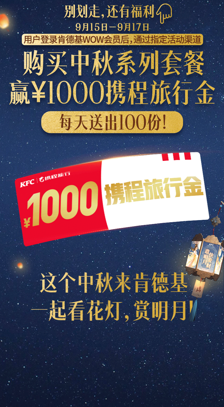中秋花灯桶和中秋四味小食拼盘自2024年9月15日起至2024年9月17日供应。中秋4件随心配自2024年9月16日起至2024年9月17日供应。活动期间,可以指定金额在指定品类中任选指定数量的指定产品,详情以菜单显示为准。活动渠道:堂食-柜台点餐、堂食-自助点餐机、堂食-自助点餐到店自取。活动时间:9:30-23:00。活动地区:全国。堂食具体供应时间以餐厅实际营业时间为准,仅限有此产品供应的部分肯德基餐厅,交通枢纽、旅游景区、西藏自治区的餐厅及精选餐厅等部分餐厅除外,具体情况以餐厅餐牌公示为准。除推广产品外,其他物品仅做装饰目的,图示内容仅供参考。产品、周边、玩具及包装以实物为准。不与其他优惠共享。堂食、肯德基宅急送自有渠道、第三方外卖平台外送渠道、甜品站、团购渠道、企业送渠道及其他渠道的产品组合、价格及优惠活动,以各渠道页面展示为准。肯德基周末疯狂拼活动自2024年9月1日起至2024年9月29日,仅限双休日。活动期间,选购指定区域活动产品满足相应数量,则所选购活动产品可享相应的套餐价格。指定区域产品可选范围以点餐渠道中的菜单内容及相关说明为准。辣芝士流心鸡块自2024年9月15日起上市,共限量91万份,售完即止。活动渠道:堂食-柜台点餐、堂食-自助点餐机、堂食-自助点餐到店自取、外送-肯德基超级APP外送到家、外送-肯德基宅急送美团外卖平台、外送-肯德基宅急送饿了么外卖平台、外送-肯德基宅急送企业送、外送-肯德基+微信小程序、外送-肯德基支付宝小程序。活动时间:9:30-20:00。活动地区:全国。堂食具体供应时间以餐厅实际营业时间为准,仅限有此产品供应的部分肯德基餐厅,交通枢纽、旅游景区、西藏自治区的餐厅及精选餐厅等部分餐厅除外,具体情况以餐厅餐牌公示为准;外送部分送餐区域不供应此产品,详情以输入地址后显示的菜单及送餐时间为准。除推广产品外,其他物品仅做装饰目的,图示内容仅供参考。产品、周边、玩具及包装以实物为准。活动自2024年9月14日至9月17日。活动期间,肯德基WOW会员可在“我的卡包”查看到店专享“指定冰淇淋同款买一送一(堂食&肯德基甜品站&K咖啡速取窗产品可选范围:原味花筒、绿色心情奶乎乎花筒(单旋)、绿色心情奶乎乎圣代(单旋)、绿色心情奶乎乎K飓风、湖盐花筒(单旋)、湖盐圣代(单旋)、荔枝滇红茶味花筒(单旋)、荔枝滇红茶味圣代(单旋)、经典草莓圣代、超糯糯麻薯草莓圣代、K飓风(奥利奥),11选1)”、外送专享“指定冰淇淋同款买一送一(肯德基宅急送产品可选范围:经典草莓圣代、绿色心情奶乎乎圣代(单旋)、湖盐圣代(单旋)、荔枝滇红茶味圣代(单旋)、超糯糯麻薯草莓圣代,5选1)”。同一用户在活动期限内每日可领取2张电子优惠券,每张电子优惠券每日仅限使用1次。电子优惠券具体使用规则详见“我的卡包”券说明。活动地区:全国。活动期间,会员凭到店专享优惠券自助点餐到店自取或凭外送专享优惠券在肯德基宅急送订餐,以菜单单品价购买指定产品1份,即可得同款产品1份。肯德基宅急送渠道如遇经典草莓圣代、绿色心情奶乎乎圣代(单旋)、湖盐圣代(单旋)、荔枝滇红茶味圣代(单旋)、超糯糯麻薯草莓圣代售罄,凭券可替换为原味圣代(黑糖珍珠酱)。绿色心情奶乎乎冰淇淋系列产品自2024年8月17日起在全国范围内陆续上市,绿色心情奶乎乎花筒(单旋)全国限量120万个,绿色心情奶乎乎圣代(单旋)全国限量50万个,绿色心情奶乎乎K飓风全国限量7万个,售完即止。湖盐花筒自2024年7月8日在全国范围内陆续上市,湖盐花筒(单旋)全国限量200万个,售完即止。湖盐圣代自2024年8月2日在全国范围内陆续上市,湖盐圣代(单旋)全国限量50万个,售完即止。荔枝滇红茶味冰淇淋系列产品自2024年5月13日在全国范围内陆续上市,荔枝滇红茶味花筒(单旋)全国限量180万个,荔枝滇红茶味圣代(单旋)全国限量80万个,售完即止。不同餐厅的价格不同,具体以各餐厅餐牌公示的实际价格为准。同一ID、同一设备、同一手机号、同一支付账户、同一取餐联系电话、同一送餐联系电话、同一送餐地址,均视为同一用户。对于任何通过不正当手段(包括但不限于作弊、通过机器行为等方式恶意刷单)参加活动获取权益或者不符合活动规则的行为,我们将在不事先通知的前提下取消该用户参与活动的资格和已获得的相应权益。堂食具体供应时间以餐厅实际营业时间为准,仅限有此产品供应的部分肯德基餐厅,交通枢纽、旅游景区、西藏自治区的餐厅及精选餐厅等部分餐厅除外,具体情况以餐厅餐牌公示为准;外送部分送餐区域不供应此产品,详情以输入地址后显示的菜单及送餐时间为准。除推广产品外,其他物品仅做装饰目的,图示内容仅供参考。产品、周边、玩具及包装以实物为准。不与其他优惠共享。2024年9月15日至2024年9月17日,用户登录肯德基WOW会员后,通过指定活动渠道购买任一肯德基中秋系列套餐产品:中秋花灯桶(三堡桶)/中秋花灯桶(双堡桶)/中秋四味小食拼盘/中秋4件随心配(2024年9月16日至2024年9月17日供应),完成订单后(外送餐品需送达后)即视为参与活动,有机会获得携程电子礼品卡1份(价值1000元,共300份)。活动渠道:堂食-自助点餐到店自取、外送-肯德基超级APP外送到家、外送-肯德基+微信小程序、外送-肯德基支付宝小程序。活动时间:9:30-23:00,具体以餐厅实际营